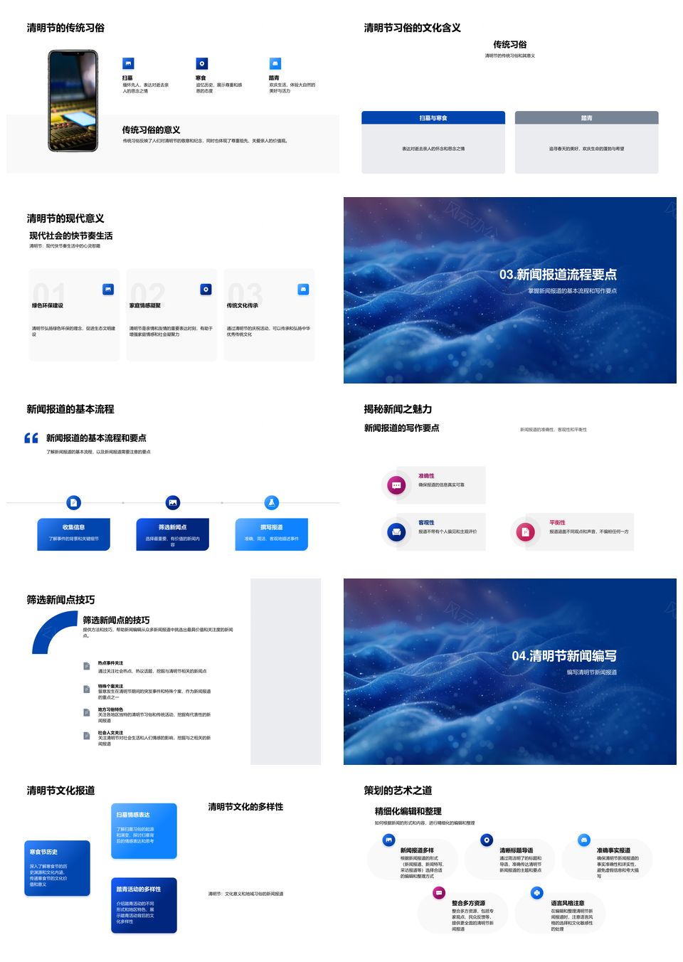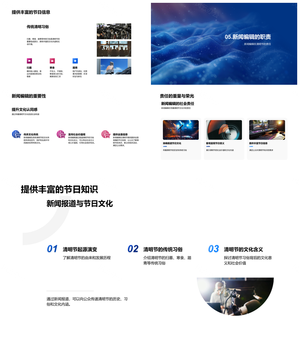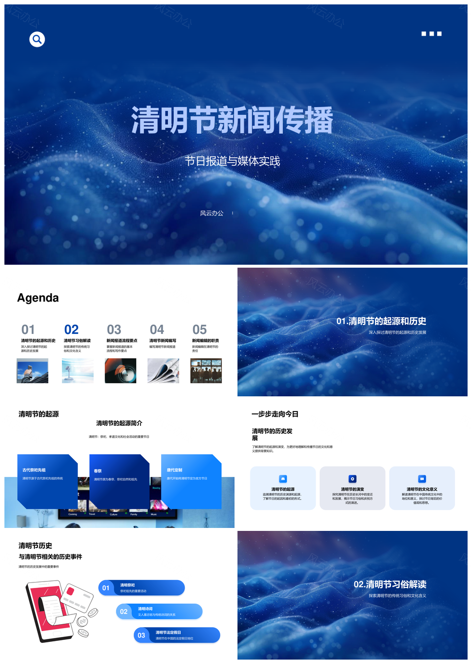 风云办公提供的清明节新闻传播媒体实践起源习俗历史PPT模板,下载格式为pptx,一共23页,作品中文字及图均可以修改和编辑,图片更改请在作品中右键图片并更换,文字修改请直接点击文字进行修改。