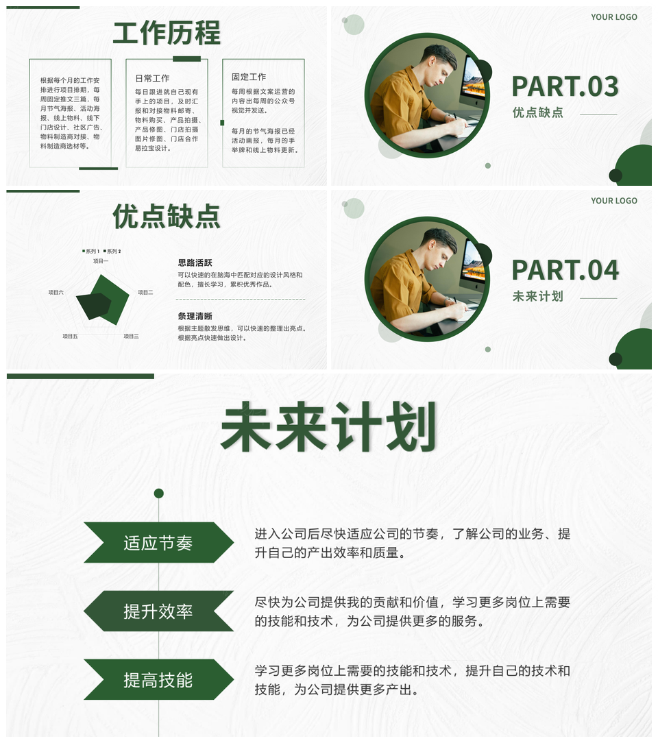 风云办公提供的绿色简约设计师个人简介面试竞聘简历PPT模板,下载格式为pptx,一共13页,作品中文字及图均可以修改和编辑,图片更改请在作品中右键图片并更换,文字修改请直接点击文字进行修改。