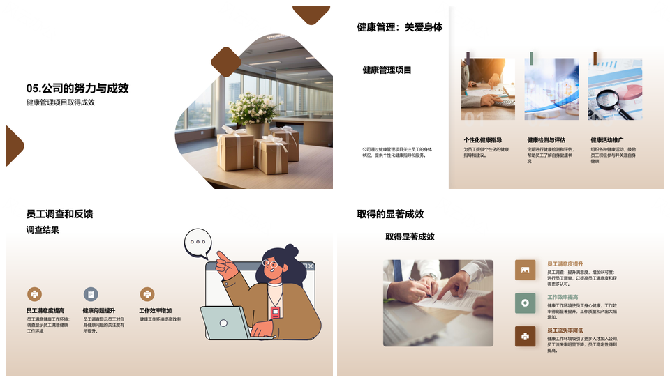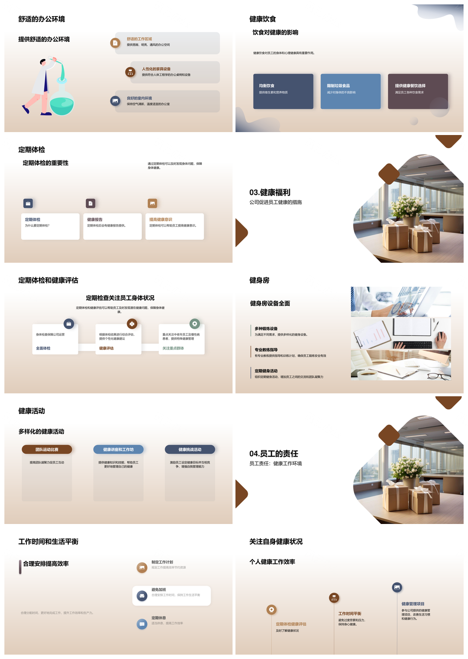 这是一张健康办公环境饮食体检提升员工效率生产力PPT模板,包含健康、办公环境、饮食、体检、员工、效率、生产力等主题内容,也可用作健康办公环境饮食、办公环境饮食体检、环境饮食体检提升、饮食体检提升员工、体检提升员工效率、提升员工效率生产力、健康办公环境体检、办公环境饮食提升、环境饮食员工效率、健康饮食体检员工、办公饮食提升效率、体检员工效率生产力、健康办公提升效率、环境饮食生产力、健康体检提升效率等PPT场景使用。 风云办公提供的健康办公环境饮食体检提升员工效率生产力PPT模板,下载格式为pptx,一共22页,作品中文字及图均可以修改和编辑,图片更改请在作品中右键图片并更换,文字修改请直接点击文字进行修改。
