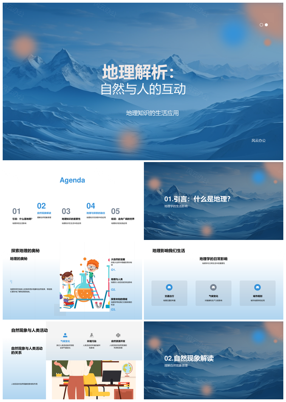 这是一张自然人类互动地理探析地球科技环境变迁PPT模板,包含自然、人类、互动、地理、探析、地球、科技、环境、变迁等主题内容,也可用作地球科技环境变迁、自然地理环境变迁、地理探析地球科技、自然人类地理环境、自然人类互动、地球科技环境、探析地球科技、科技环境变迁、自然地理环境、自然环境变迁、地球科技、环境变迁、自然地理、人类互动、地理探析等PPT场景使用。 风云办公提供的自然人类互动地理探析地球科技环境变迁PPT模板,下载格式为pptx,一共23页,作品中文字及图均可以修改和编辑,图片更改请在作品中右键图片并更换,文字修改请直接点击文字进行修改。