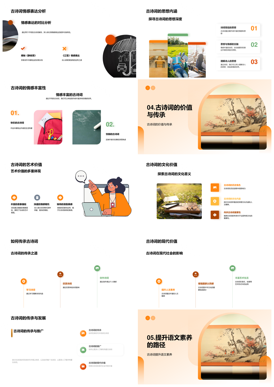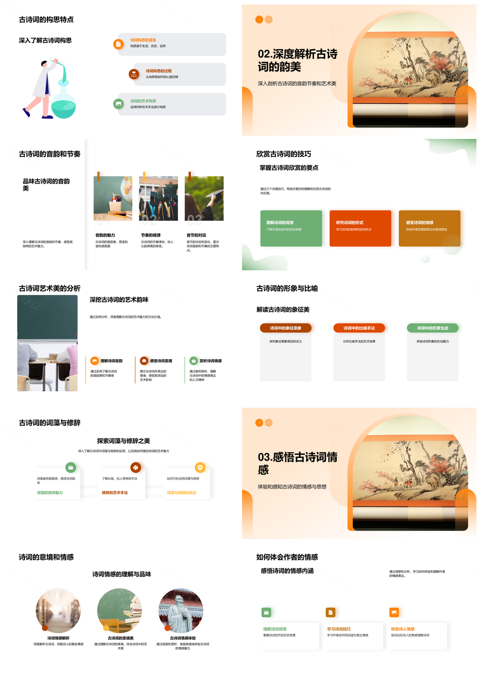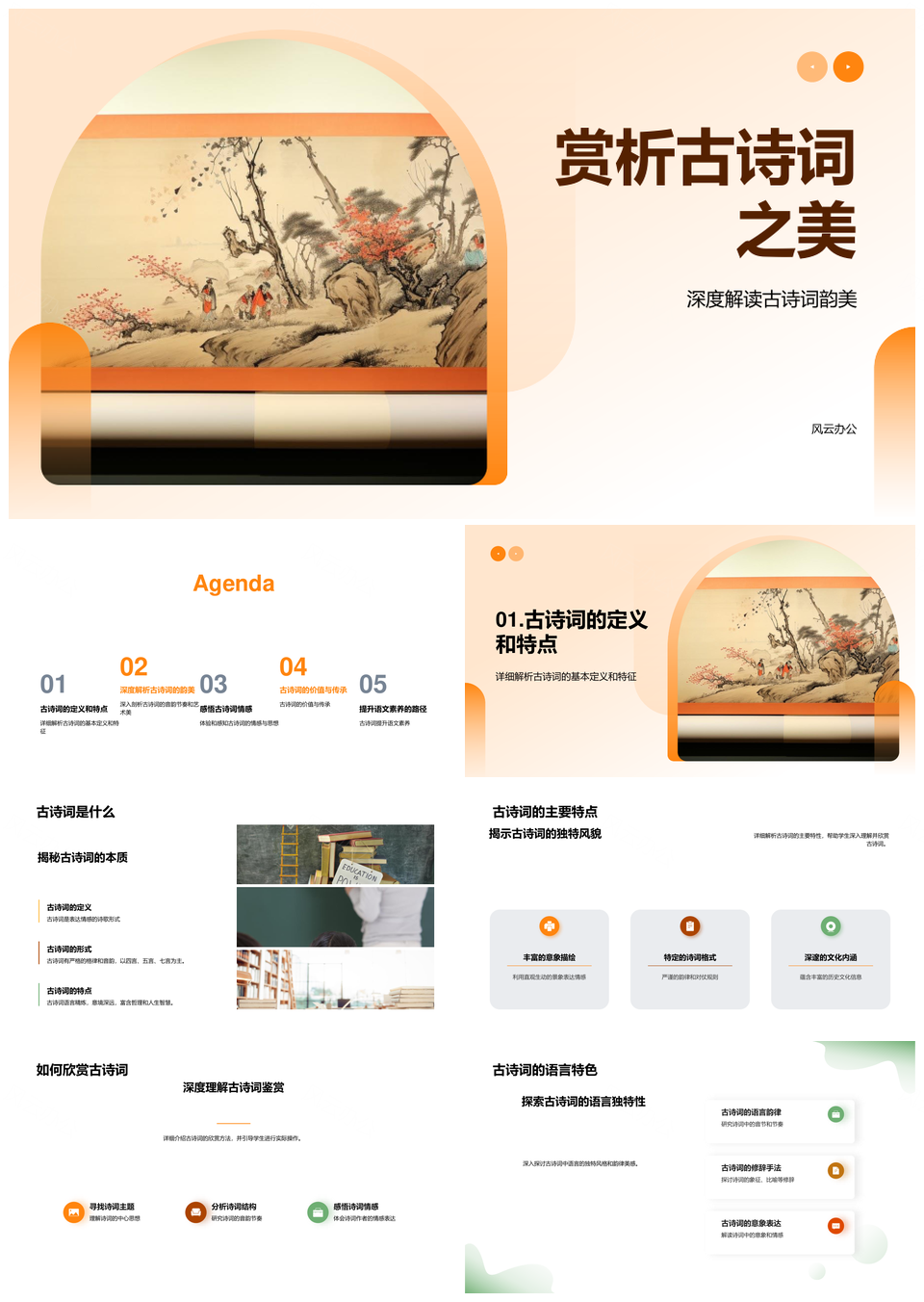 风云办公提供的古诗词音韵艺美情感文化卷轴赏析PPT模板,下载格式为pptx,一共33页,作品中文字及图均可以修改和编辑,图片更改请在作品中右键图片并更换,文字修改请直接点击文字进行修改。