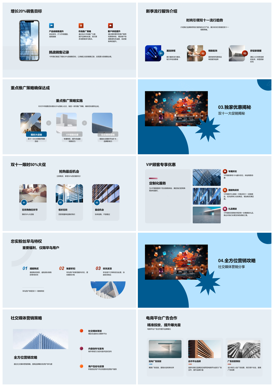 这是一张双十一服饰电商销售增长攻略主推5折促销策略PPT模板,包含双十一、服饰、电商、销售增长、攻略、主推、5折、促销策略等主题内容,也可用作双十一服饰电商攻略、服饰电商销售增长攻略、双十一主推5折促销策略、服饰电商主推5折促销、双十一服饰电商、服饰电商销售增长、电商销售增长攻略、主推5折促销策略、双十一主推5折促销、双十一服饰、服饰电商、电商销售增长、销售增长攻略、主推5折促销、5折促销策略等PPT场景使用。 风云办公提供的双十一服饰电商销售增长攻略主推5折促销策略PPT模板,下载格式为pptx,一共23页,作品中文字及图均可以修改和编辑,图片更改请在作品中右键图片并更换,文字修改请直接点击文字进行修改。