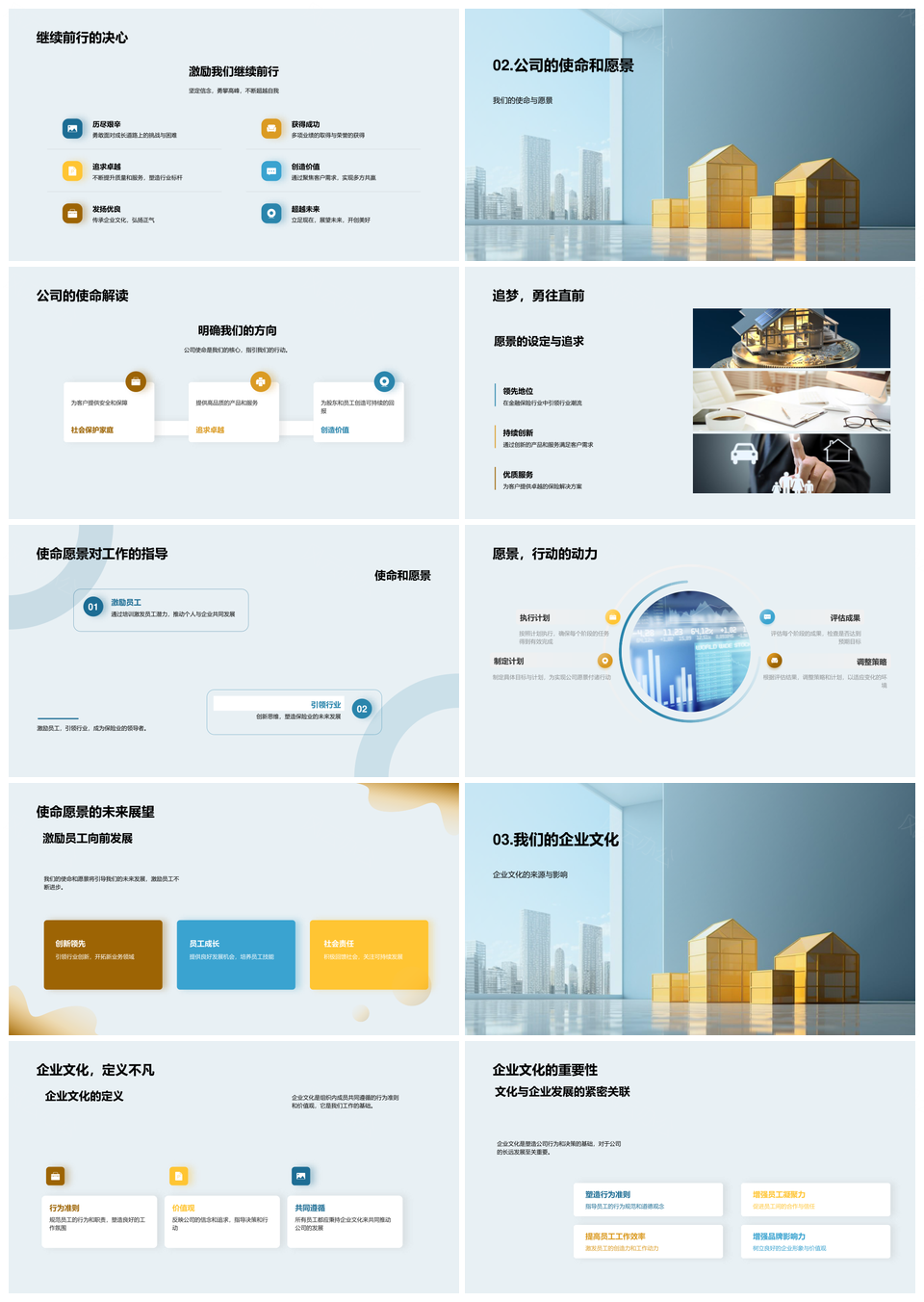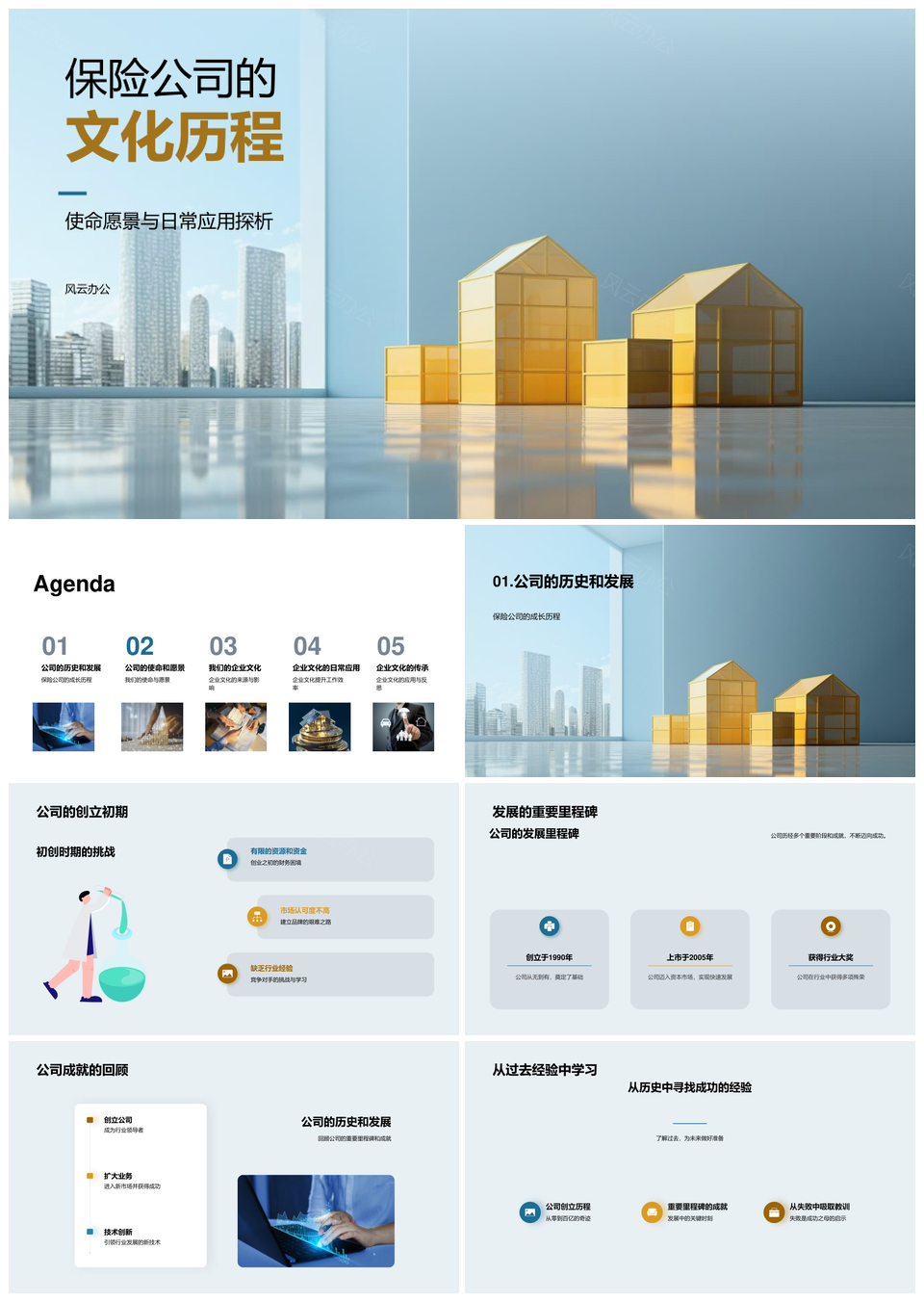 风云办公提供的保险公司文化与使命愿景发展历程PPT模板,下载格式为pptx,一共33页,作品中文字及图均可以修改和编辑,图片更改请在作品中右键图片并更换,文字修改请直接点击文字进行修改。