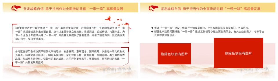 这是一张2025坚定战略自信勇担当作为第四次一带一路建设座谈会学习PPT模板,包含2025、坚定、战略、自信、勇担当、作为、第四次、一带一路、建设、座谈会、学习等主题内容,也可用作坚定战略自信勇担当作为、第四次一带一路建设座谈会、一带一路建设座谈会学习、坚定战略自信一带一路、战略自信勇担当作为、第四次一带一路建设、一带一路建设学习、坚定战略自信建设、第四次座谈会学习、战略自信一带一路建设、勇担当作为建设座谈会、一带一路建设坚定战略、建设座谈会学习勇、坚定第四次一带一路、战略自信座谈会学习等PPT场景使用。 风云办公提供的2025坚定战略自信勇担当作为第四次一带一路建设座谈会学习PPT模板,下载格式为pptx,一共10页,作品中文字及图均可以修改和编辑,图片更改请在作品中右键图片并更换,文字修改请直接点击文字进行修改。