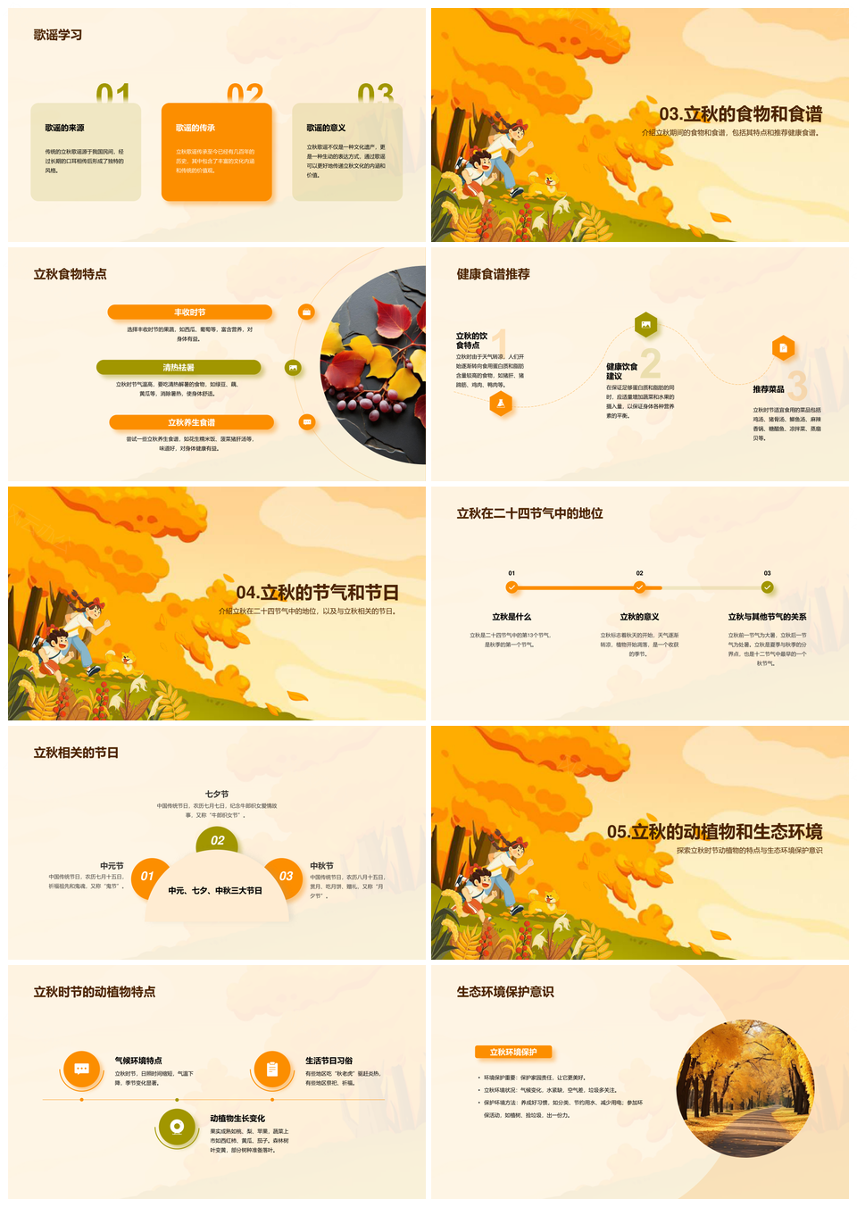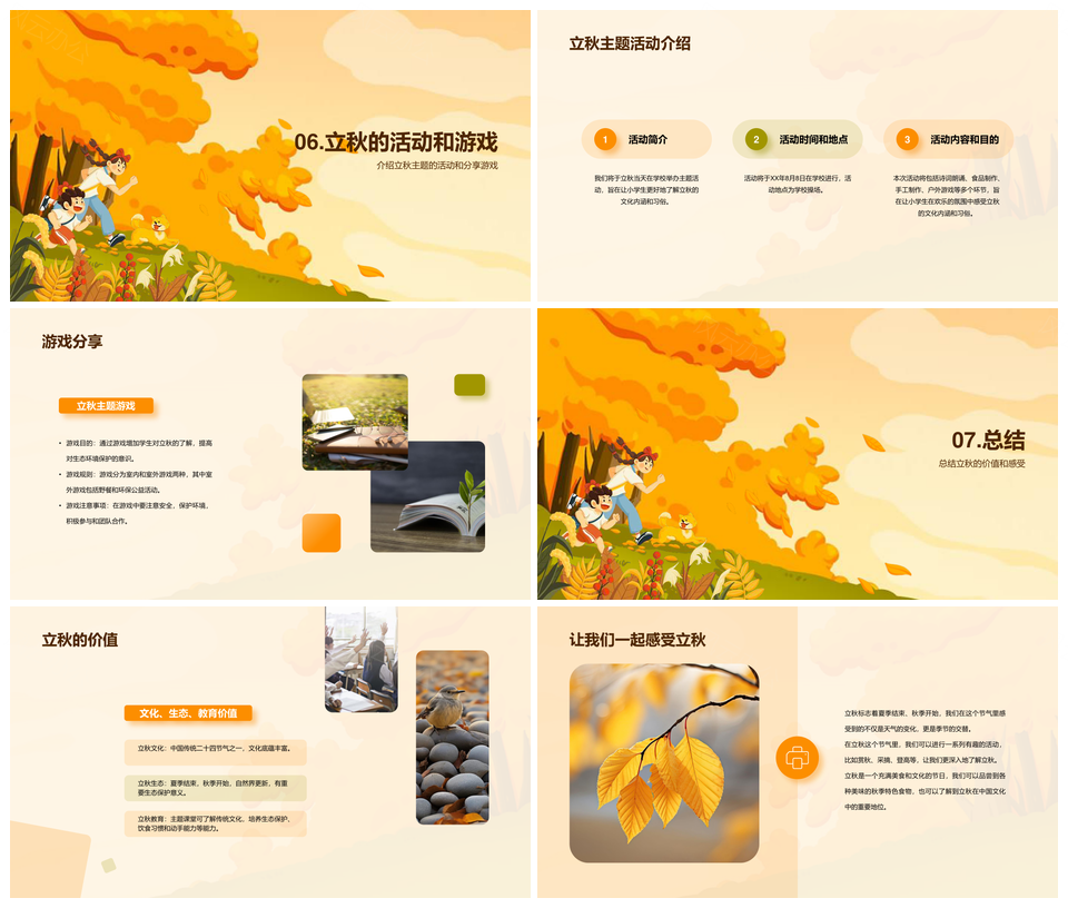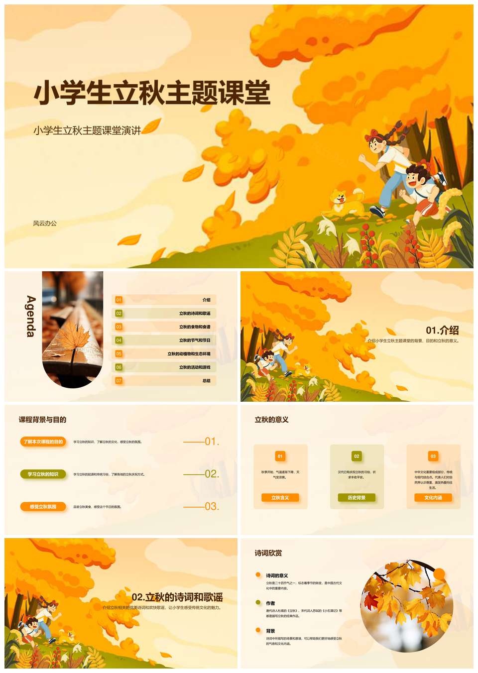 风云办公提供的橙色插画立秋节气学生班会课件PPT模板,下载格式为pptx,一共24页,作品中文字及图均可以修改和编辑,图片更改请在作品中右键图片并更换,文字修改请直接点击文字进行修改。