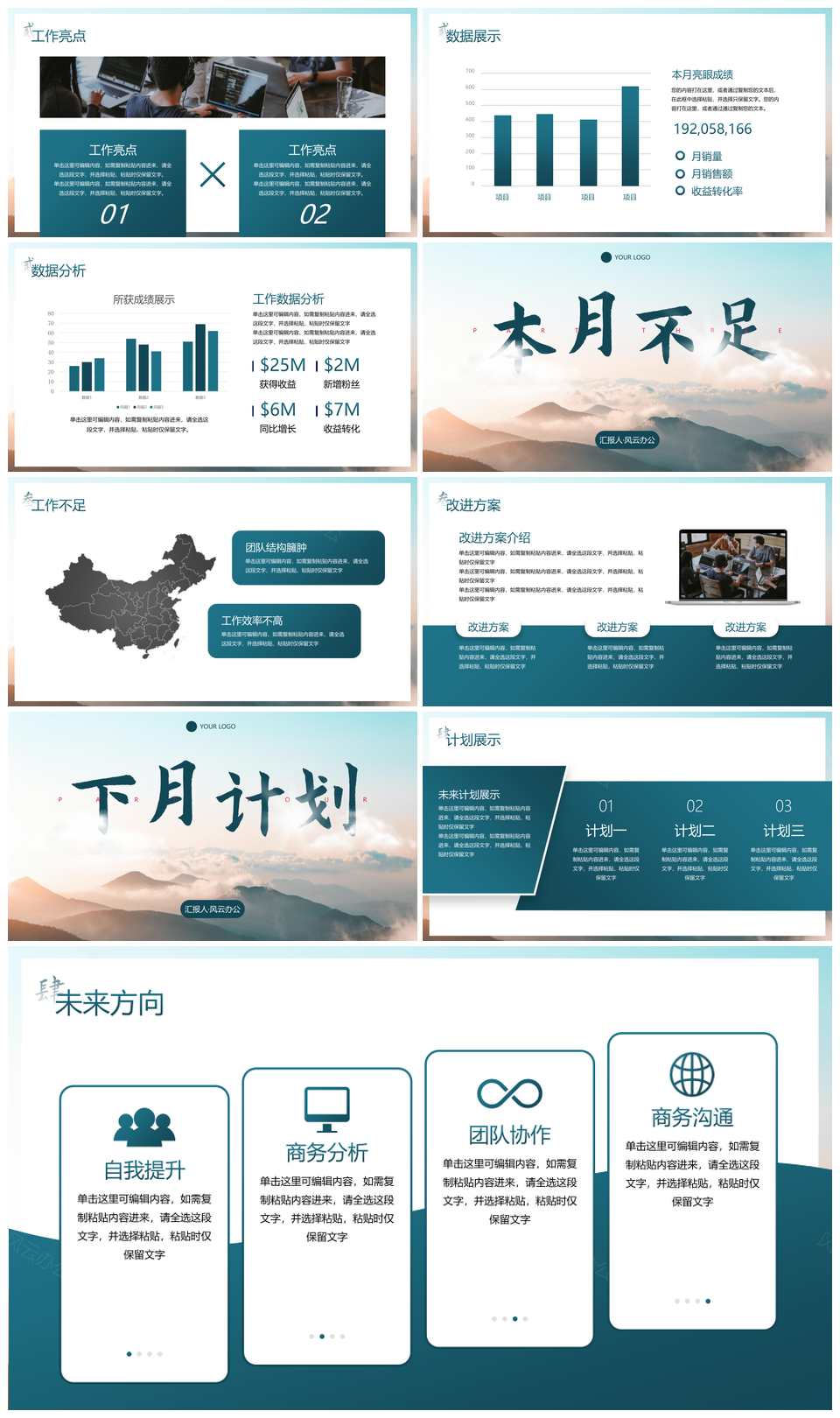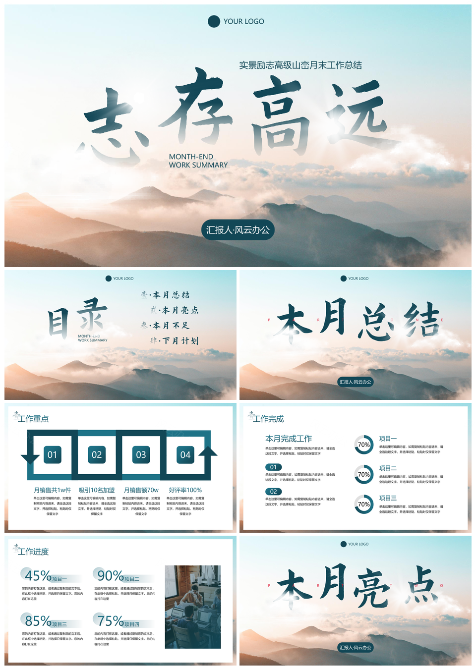 风云办公提供的高级励志实景山峦月末工作总结PPT模板,下载格式为pptx,一共17页,作品中文字及图均可以修改和编辑,图片更改请在作品中右键图片并更换,文字修改请直接点击文字进行修改。