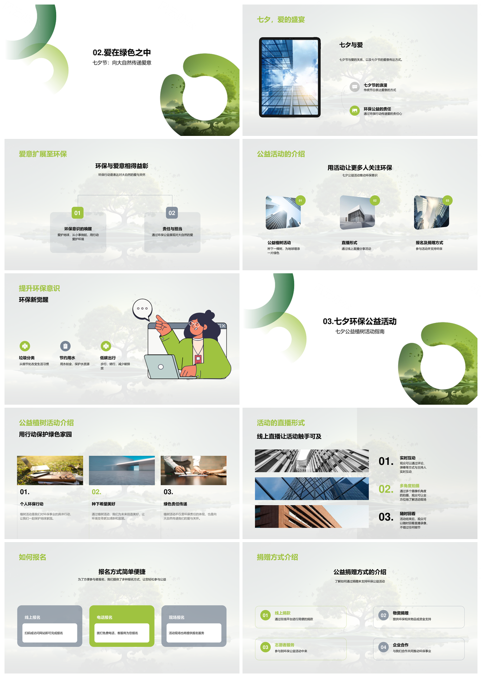 这是一张七夕公益植树筑绿色心形直播PPT模板,包含七夕、公益、植树、筑、绿色、心形、直播等主题内容,也可用作公益植树绿色心形、七夕绿色心形直播、七夕公益植树、绿色心形直播、公益植树绿色、七夕绿色心形、七夕公益、公益植树、绿色心形、心形直播、绿色直播、七夕绿色、公益绿色、植树绿色、植树心形等PPT场景使用。 风云办公提供的七夕公益植树筑绿色心形直播PPT模板,下载格式为pptx,一共28页,作品中文字及图均可以修改和编辑,图片更改请在作品中右键图片并更换,文字修改请直接点击文字进行修改。