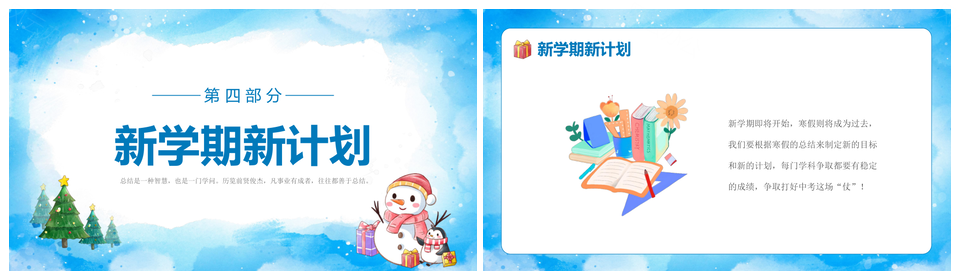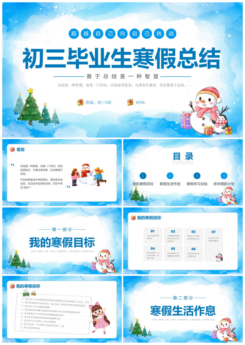 蓝色水彩雪人企鹅初三毕业班寒假总结班会PPT模板推荐