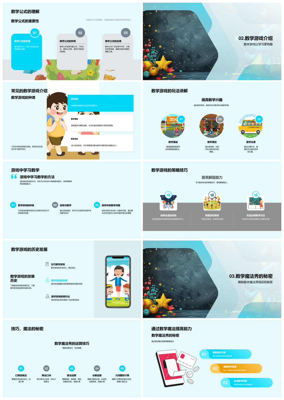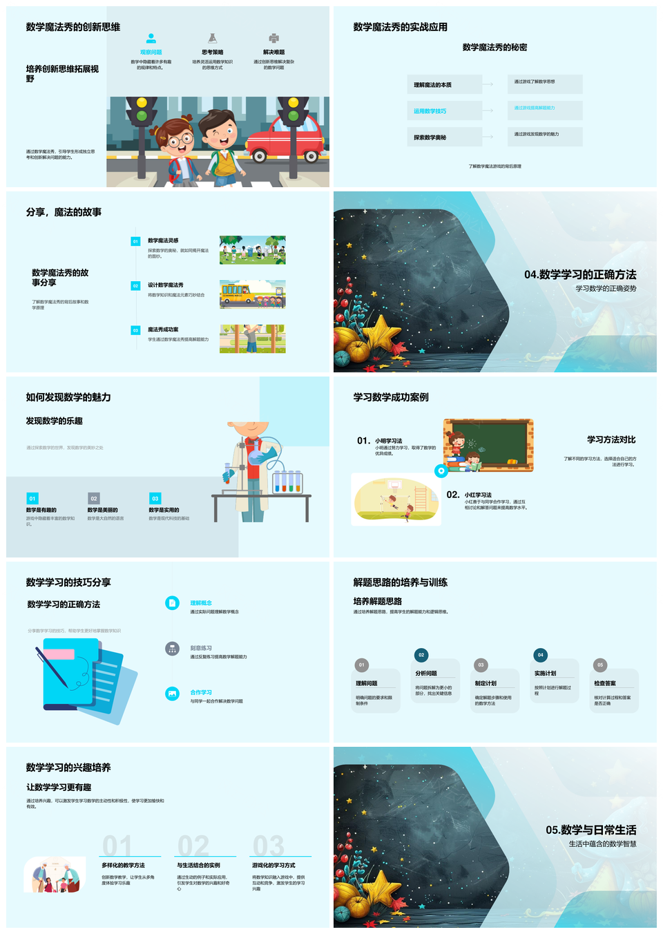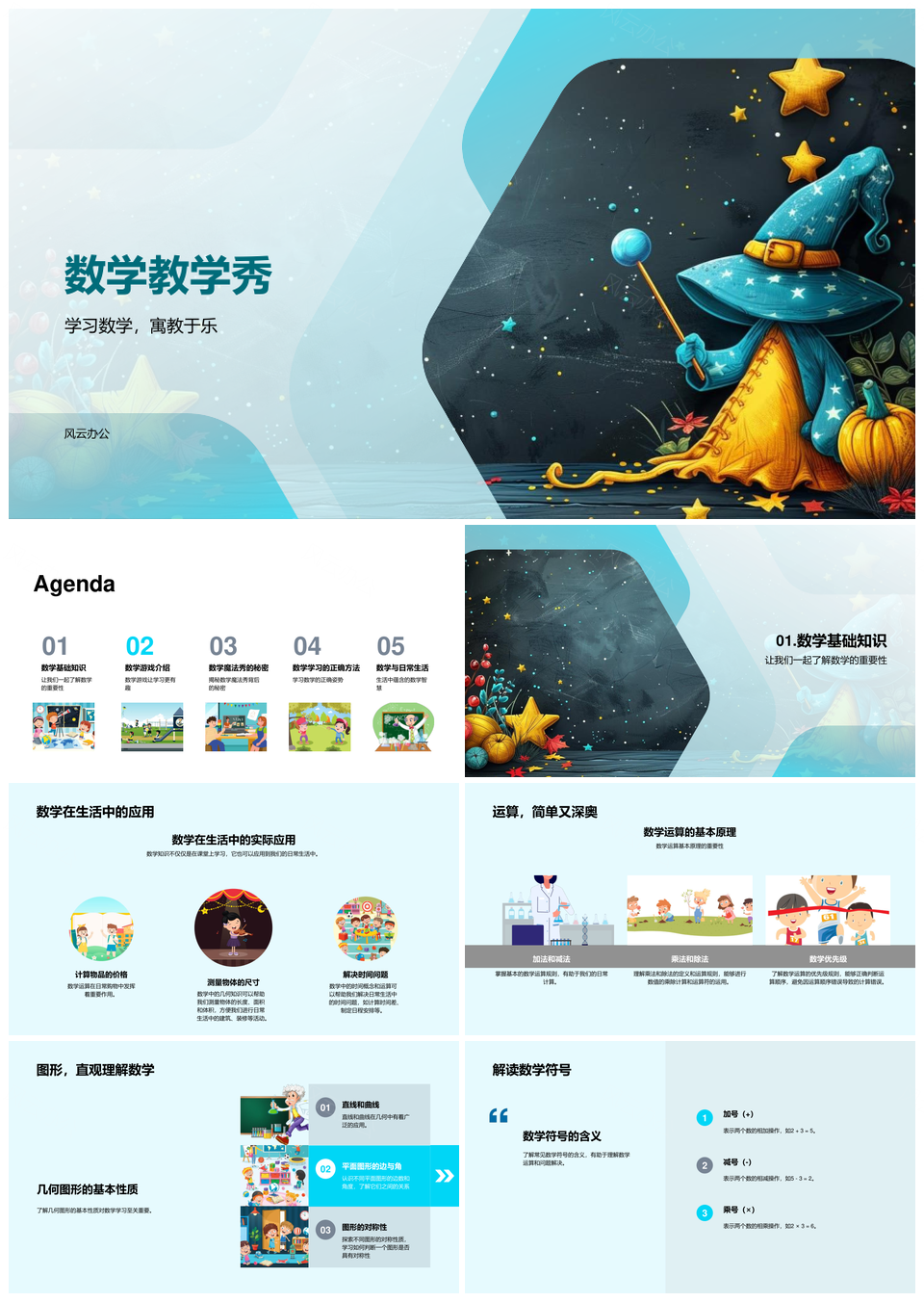 风云办公提供的数学魔法秀基础运算几何解题逻辑思维PPT模板,下载格式为pptx,一共33页,作品中文字及图均可以修改和编辑,图片更改请在作品中右键图片并更换,文字修改请直接点击文字进行修改。