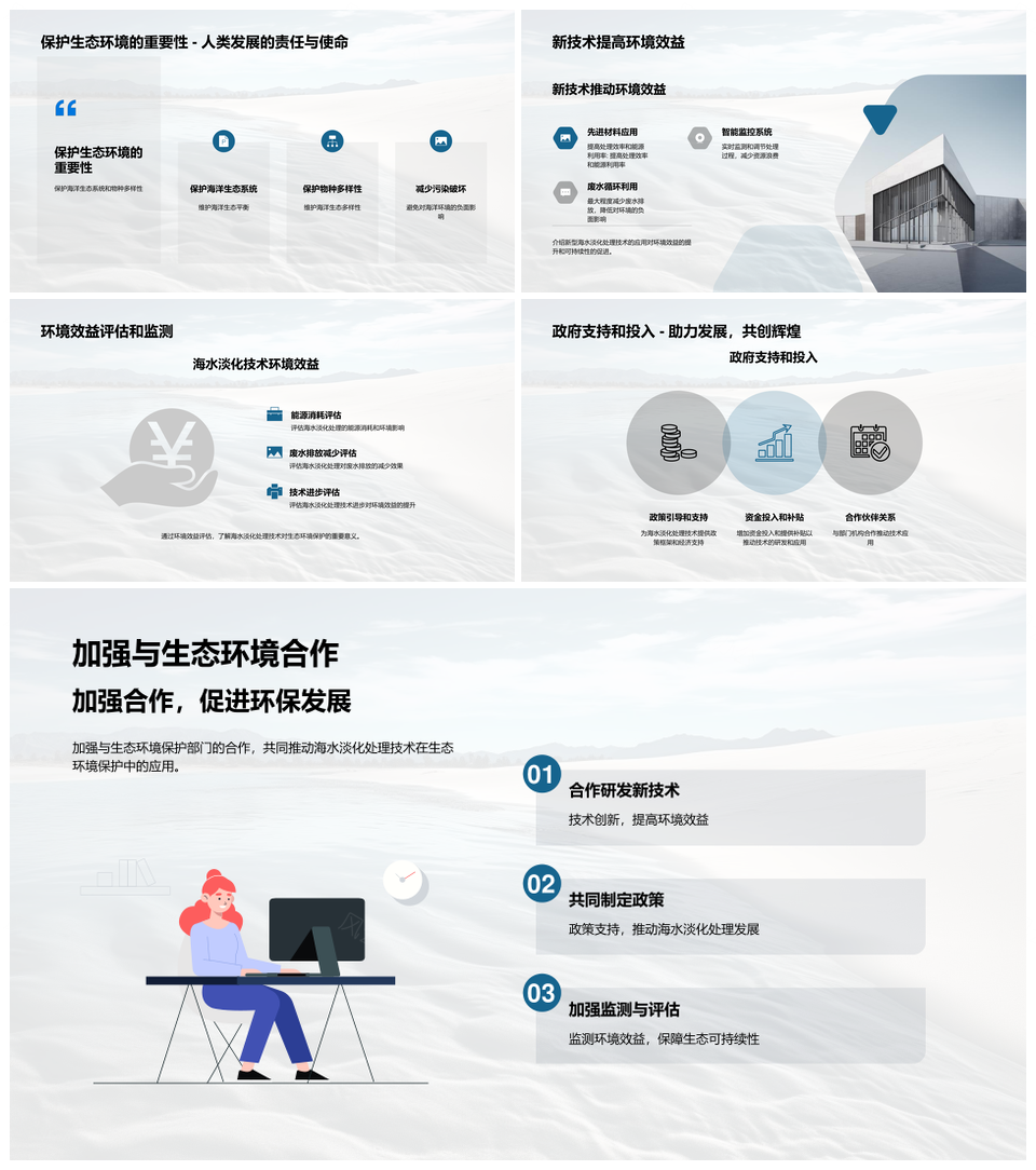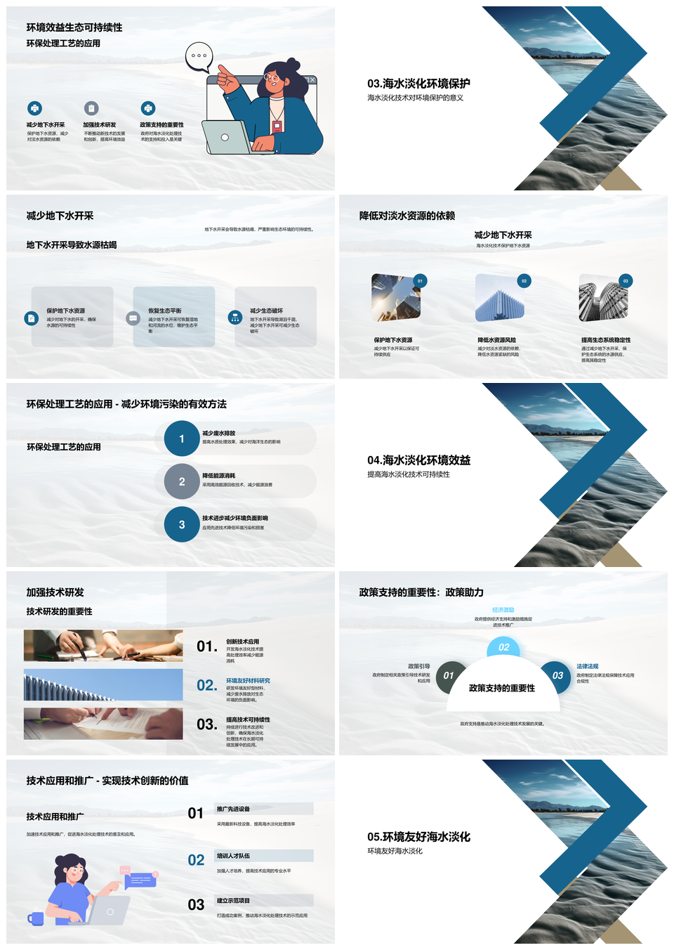 这是一张海水淡化技术环保节能减废护生态PPT模板,包含海水淡化技术、环保、节能、减废、护生态等主题内容,也可用作海水淡化技术环保节能、技术环保节能减废、环保节能减废生态、海水淡化环保节能减废、海水淡化技术环保、技术环保节能、环保节能减废、节能减废生态、海水淡化技术节能、技术节能减废、减废生态环保、海水淡化技术、环保节能、节能减废、减废生态等PPT场景使用。