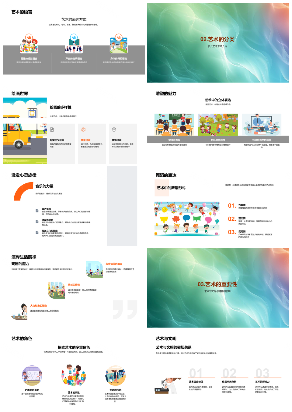 风云办公提供的艺术领域绘画雕塑音乐舞蹈戏剧魅力PPT模板,下载格式为pptx,一共33页,作品中文字及图均可以修改和编辑,图片更改请在作品中右键图片并更换,文字修改请直接点击文字进行修改。