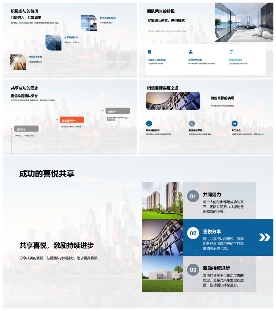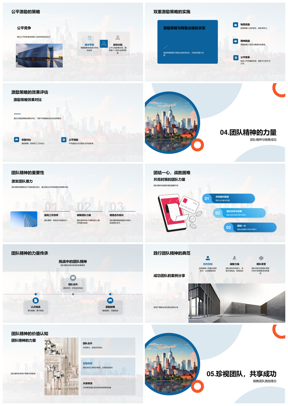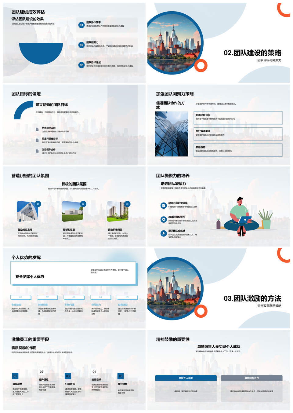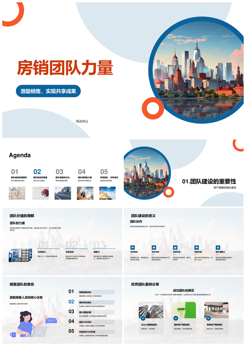风云办公提供的房地产销售团队激励协作筑摩天PPT模板,下载格式为pptx,一共33页,作品中文字及图均可以修改和编辑,图片更改请在作品中右键图片并更换,文字修改请直接点击文字进行修改。