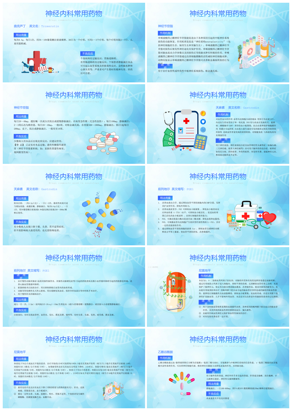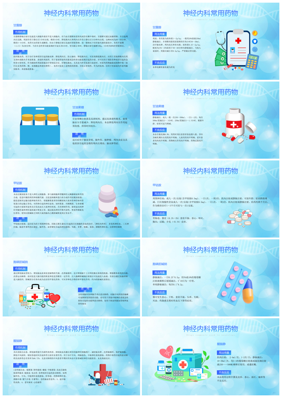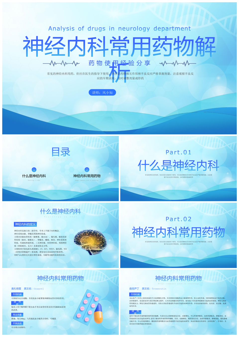 风云办公提供的蓝色简约展板神经内科常用药解析PPT模板,下载格式为pptx,一共29页,作品中文字及图均可以修改和编辑,图片更改请在作品中右键图片并更换,文字修改请直接点击文字进行修改。