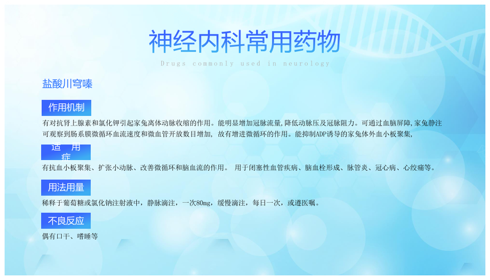 这是一张蓝色简约展板神经内科常用药解析PPT模板,包含蓝色、简约、展板、神经内科、常用药、解析等主题内容,也可用作蓝色简约展板神经内科、展板神经内科常用药解析、神经内科常用药解析展板、蓝色简约展板解析、蓝色展板神经内科常用药、简约展板神经内科解析、神经内科常用药展板解析、蓝色神经内科常用药解析、简约展板常用药解析、蓝色展板常用药解析、神经内科展板常用药解析、简约神经内科常用药展板、蓝色简约神经内科展板、展板解析神经内科常用药、神经内科常用药解析蓝色等PPT场景使用。