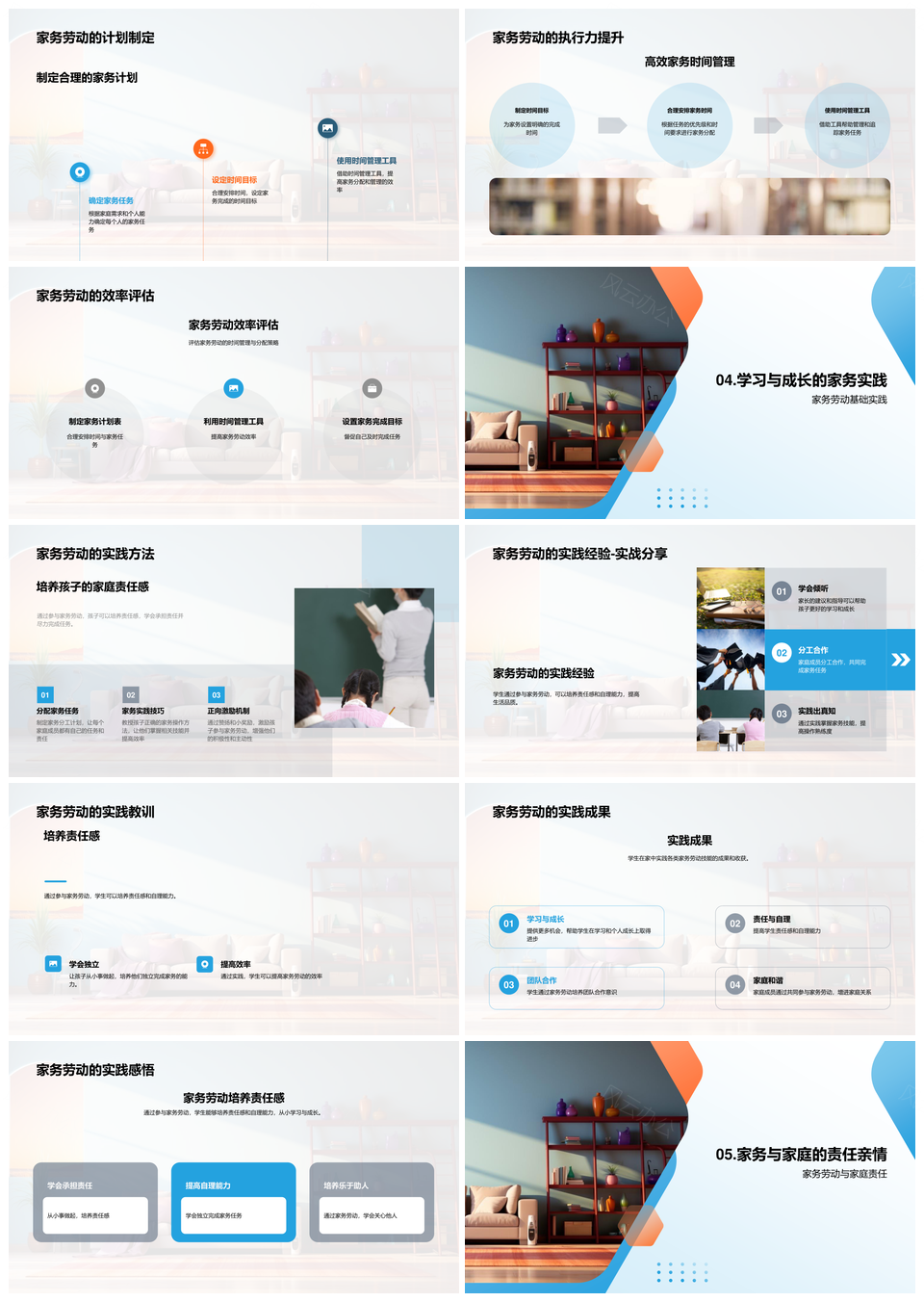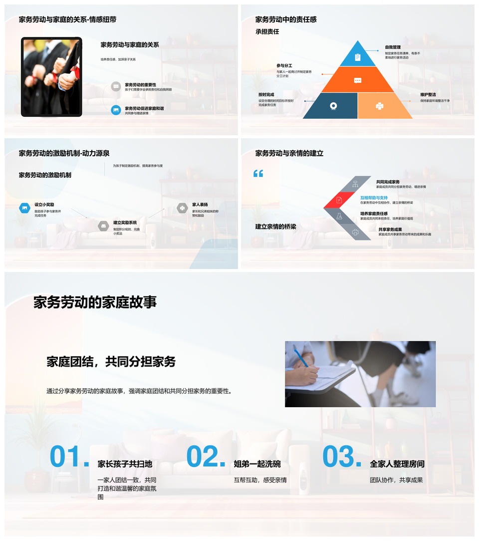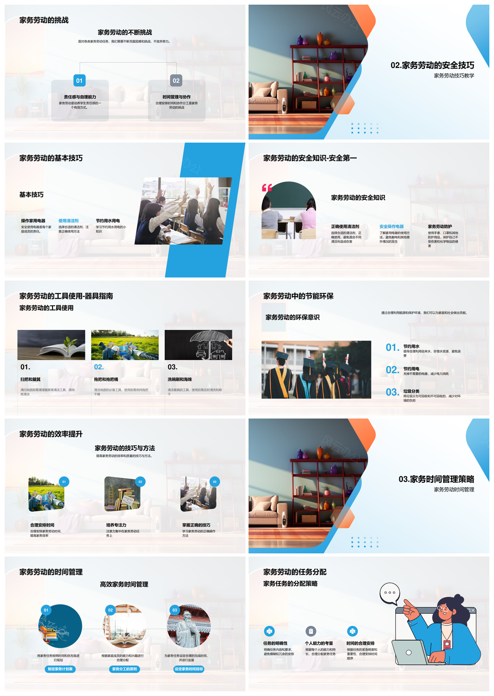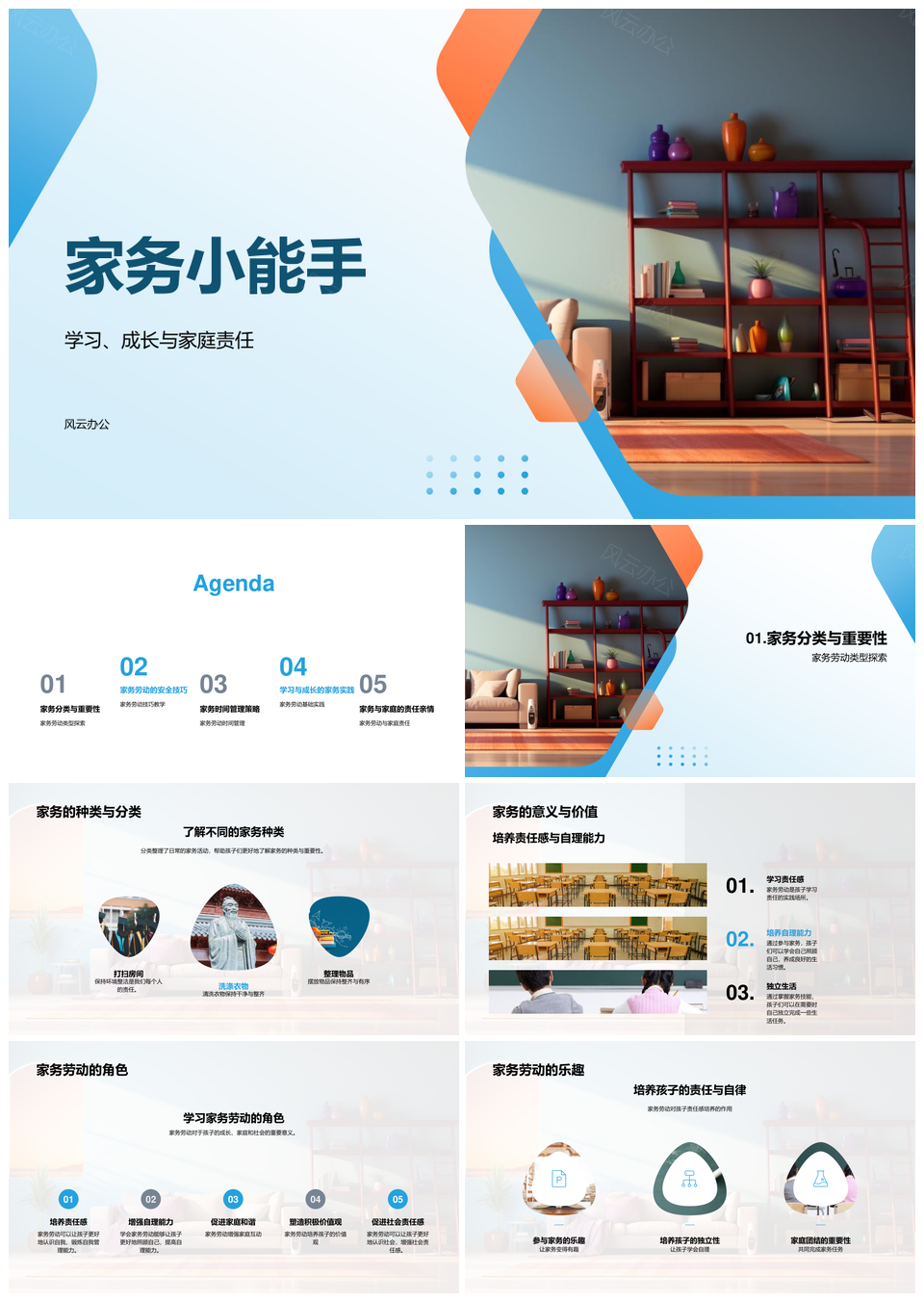 这是一张家务小能手责任技能自理分工时间清洁防护PPT模板,包含家务、小能手、责任、技能、自理、分工、时间、清洁、防护等主题内容,也可用作家务小能手责任技能自理、自理分工时间清洁防护、家务小能手自理分工、责任技能清洁防护、小能手自理时间清洁、家务分工清洁防护、责任自理分工时间、技能自理时间防护、小能手责任分工清洁、家务自理时间防护、家务小能手分工时间、技能分工清洁时间、责任分工防护清洁、自理时间清洁家务、小能手技能分工防护等PPT场景使用。 风云办公提供的家务小能手责任技能自理分工时间清洁防护PPT模板,下载格式为pptx,一共33页,作品中文字及图均可以修改和编辑,图片更改请在作品中右键图片并更换,文字修改请直接点击文字进行修改。
