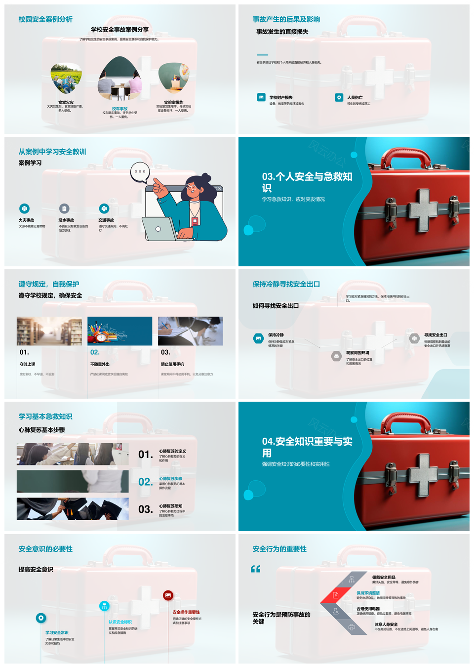 风云办公提供的校园安全教育自保急救常识操作案例PPT模板,下载格式为pptx,一共23页,作品中文字及图均可以修改和编辑,图片更改请在作品中右键图片并更换,文字修改请直接点击文字进行修改。