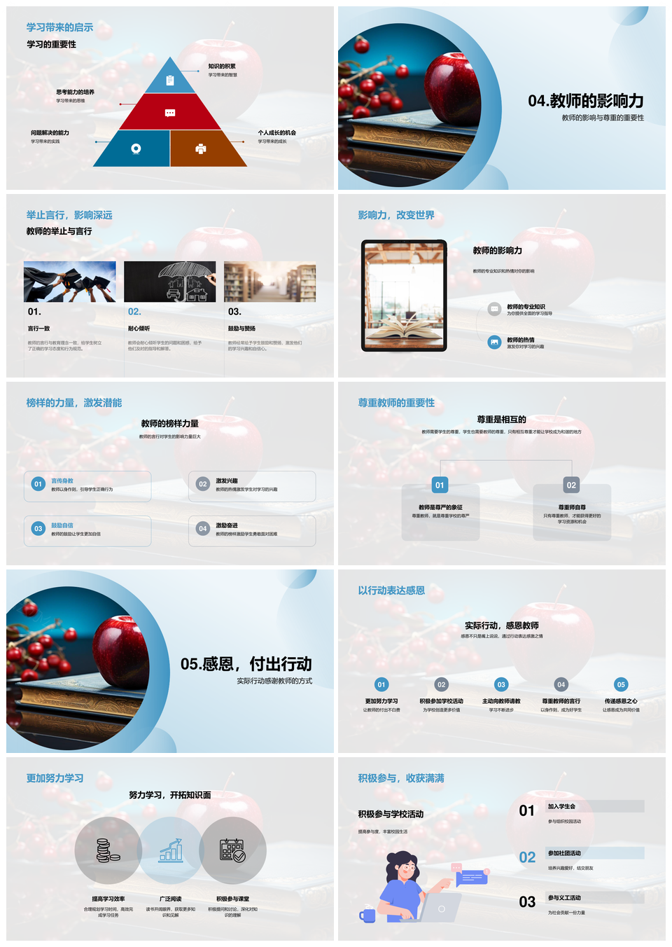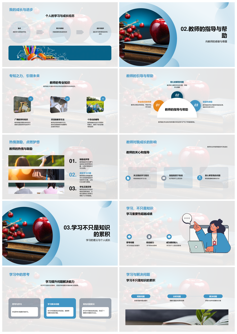 这是一张师恩指引学习成长路PPT模板,包含师恩、指引、学习、成长路等主题内容,也可用作师恩指引学习成长、师恩指引学习、师恩指引成长、指引学习成长、师恩学习成长、师恩指引、指引学习、学习成长、指引成长、师恩学习、师恩成长、指引学习成长路、师恩指引成长路、学习成长路、指引成长路等PPT场景使用。 风云办公提供的师恩指引学习成长路PPT模板,下载格式为pptx,一共30页,作品中文字及图均可以修改和编辑,图片更改请在作品中右键图片并更换,文字修改请直接点击文字进行修改。
