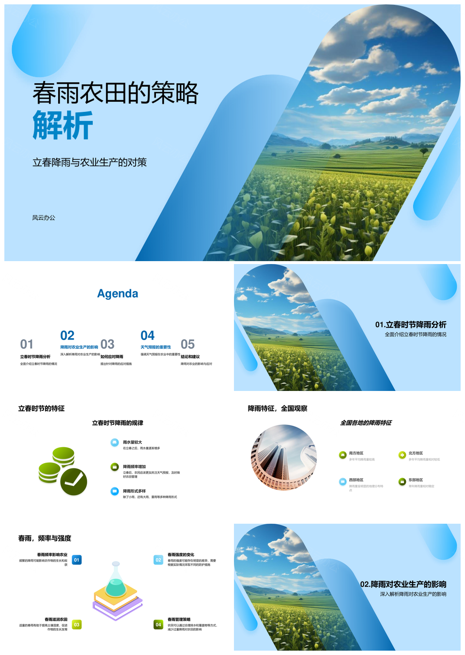 风云办公提供的春雨农田立春降雨农事应对策略解析PPT模板,下载格式为pptx,一共23页,作品中文字及图均可以修改和编辑,图片更改请在作品中右键图片并更换,文字修改请直接点击文字进行修改。