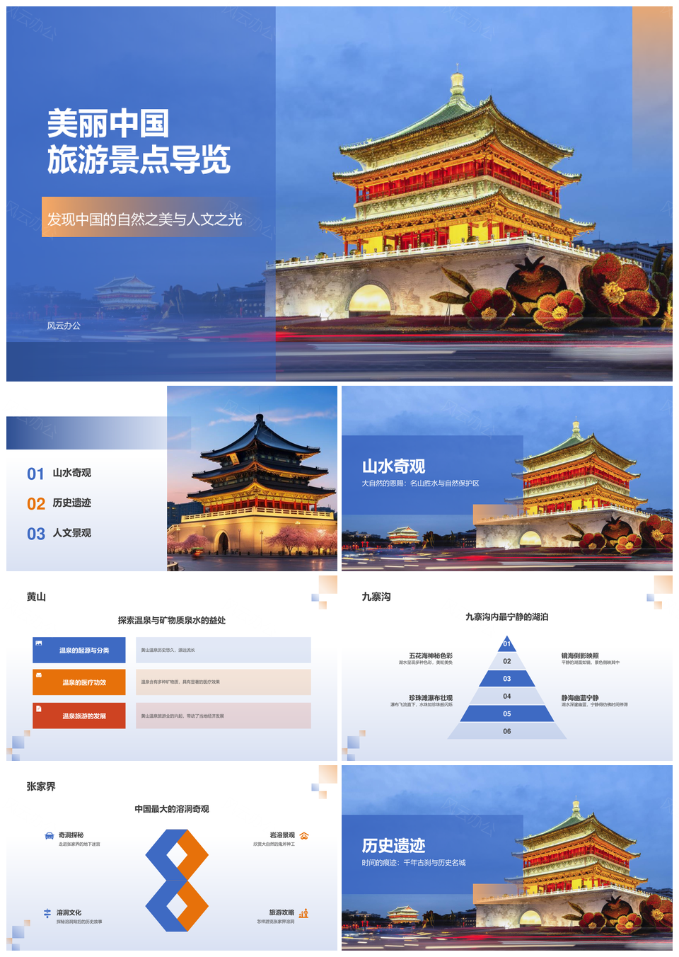 风云办公提供的商务旅游景点自然导览培训指南PPT模板,下载格式为pptx,一共16页,作品中文字及图均可以修改和编辑,图片更改请在作品中右键图片并更换,文字修改请直接点击文字进行修改。