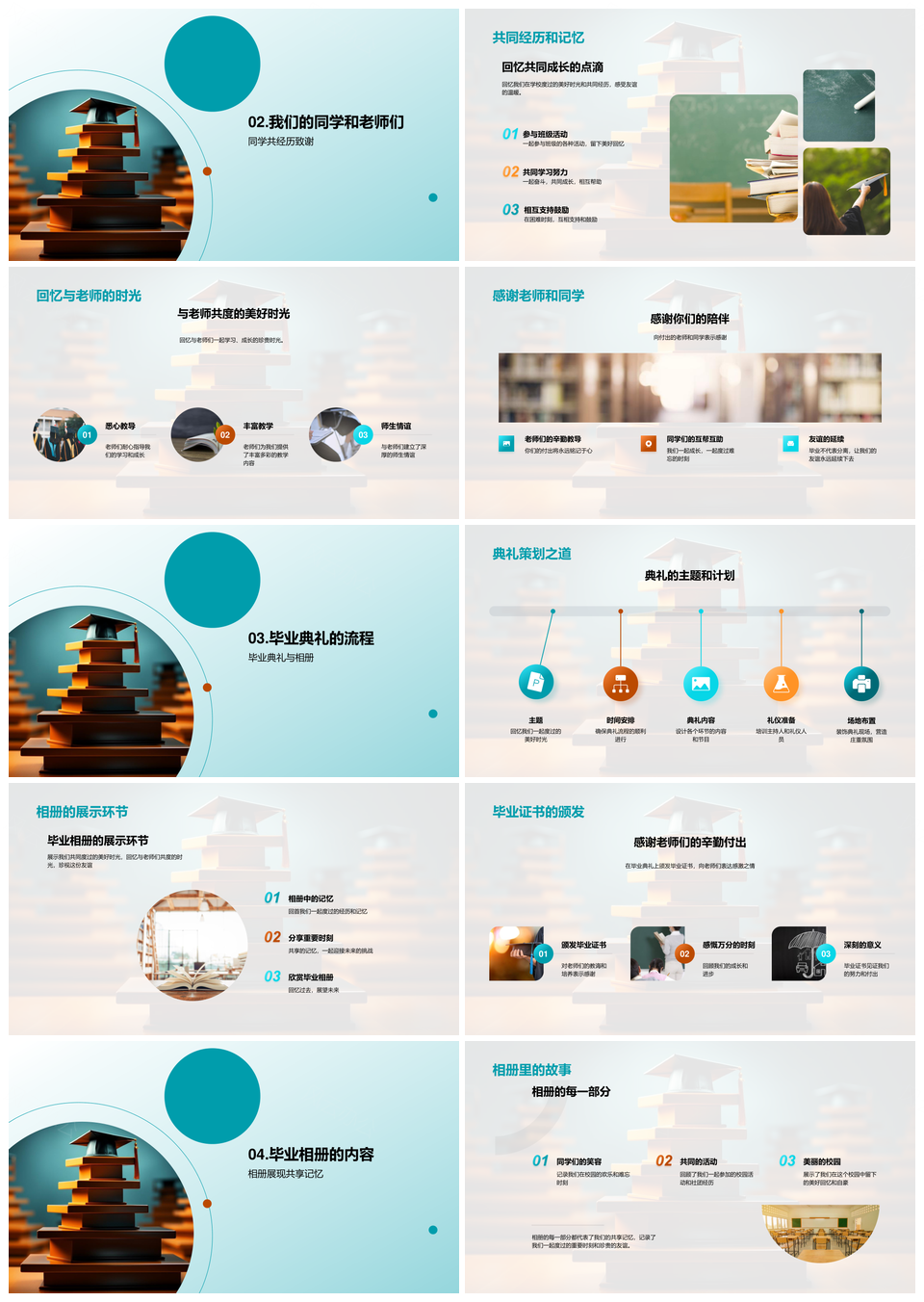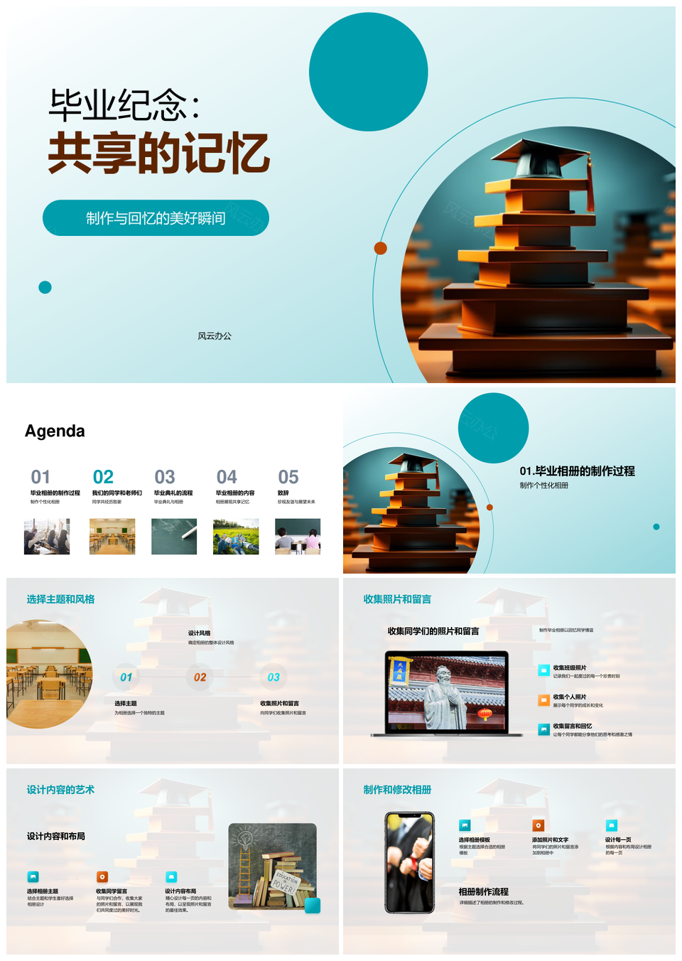 风云办公提供的毕业相册师生同窗共享典礼帽影记忆PPT模板,下载格式为pptx,一共24页,作品中文字及图均可以修改和编辑,图片更改请在作品中右键图片并更换,文字修改请直接点击文字进行修改。