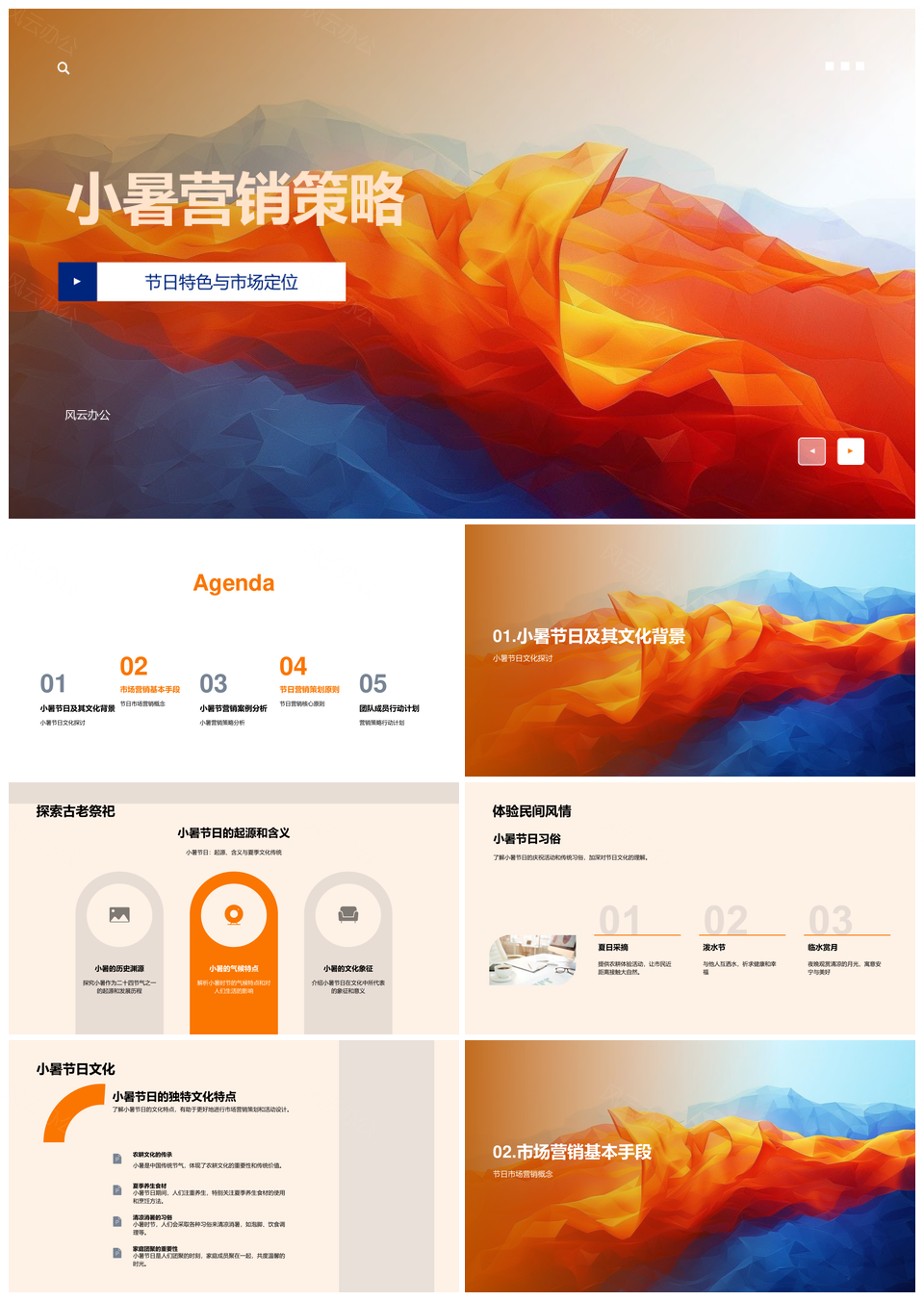 风云办公提供的小暑节日营销策略市场定位活动策划PPT模板,下载格式为pptx,一共23页,作品中文字及图均可以修改和编辑,图片更改请在作品中右键图片并更换,文字修改请直接点击文字进行修改。