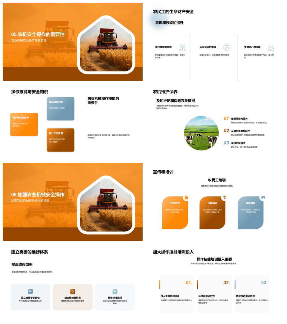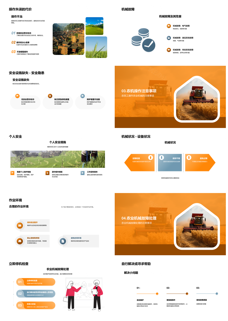 这是一张农机安全操作培训与事故故障预防PPT模板,包含农机、安全操作培训、事故、故障、预防等主题内容,也可用作农机安全操作培训、安全操作培训、农机安全操作、事故故障预防、农机安全培训、农机操作培训、农机故障预防、农机安全、安全操作、操作培训、事故故障、故障预防、农机操作、安全培训、农机故障等PPT场景使用。 风云办公提供的农机安全操作培训与事故故障预防PPT模板,下载格式为pptx,一共26页,作品中文字及图均可以修改和编辑,图片更改请在作品中右键图片并更换,文字修改请直接点击文字进行修改。