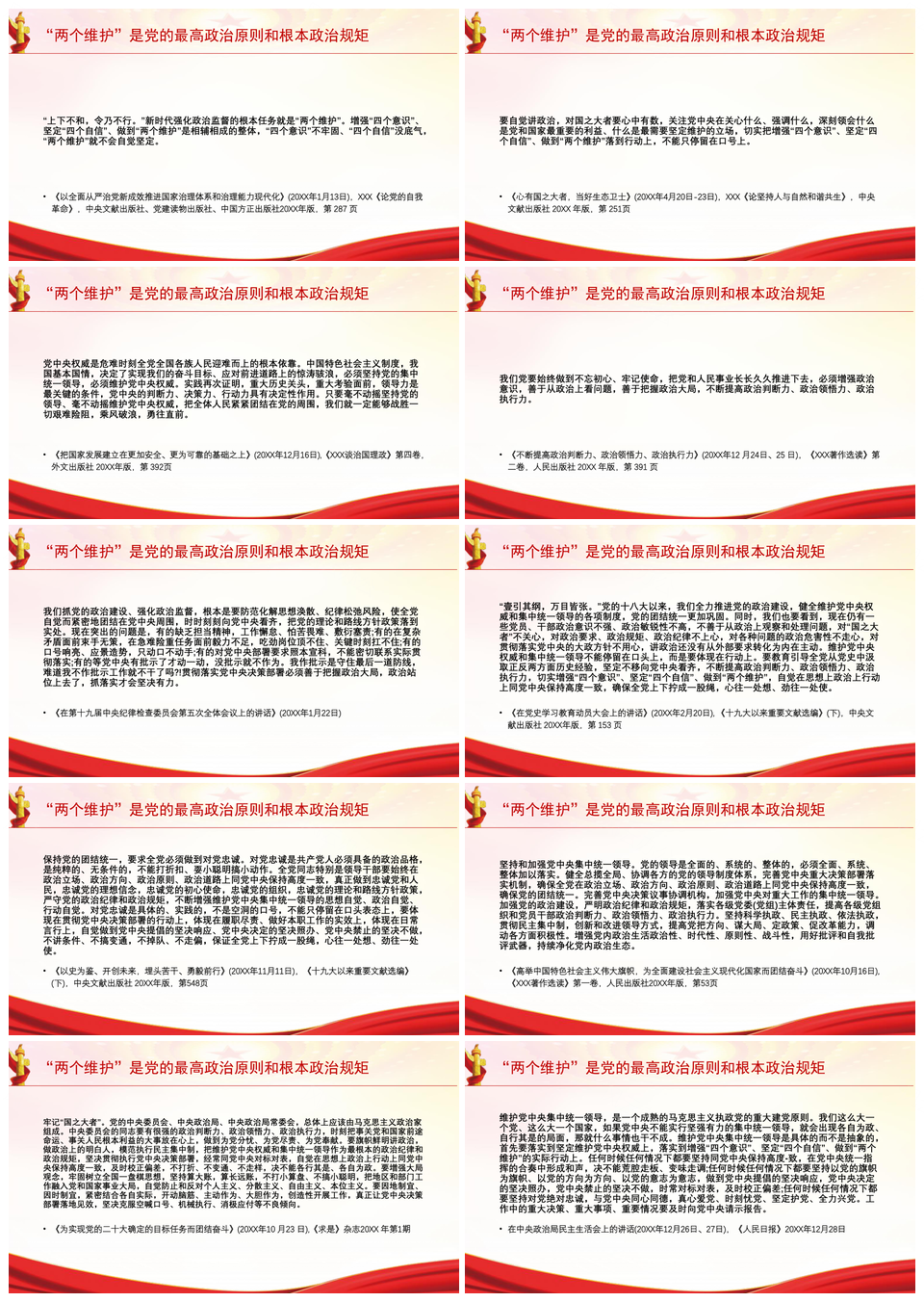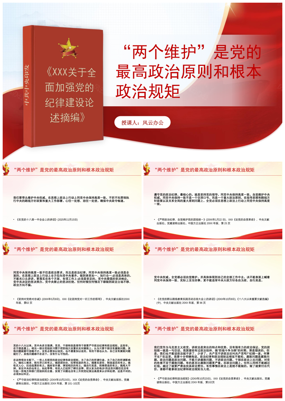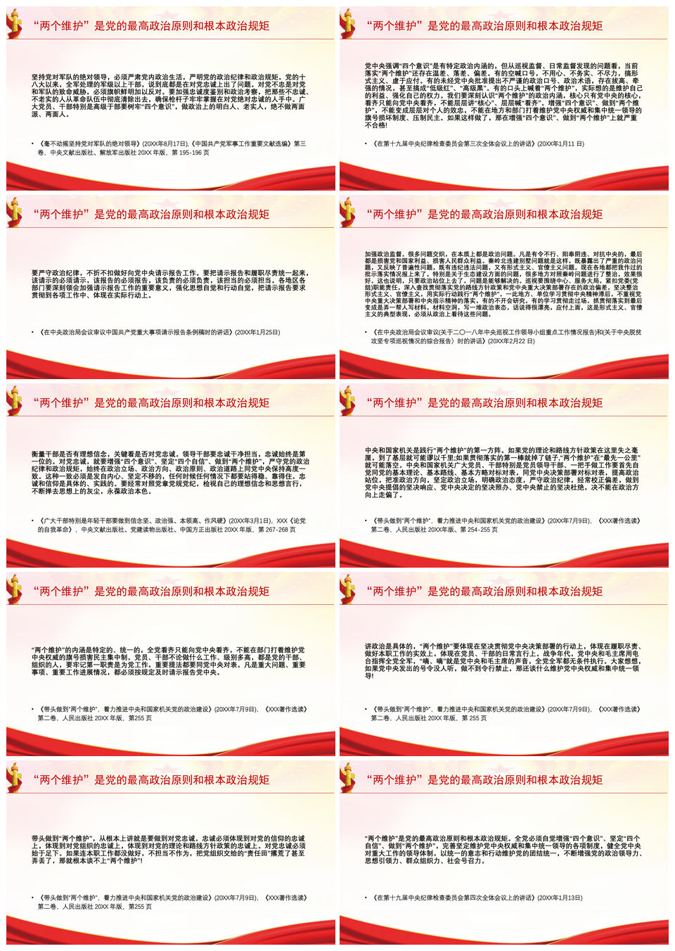这是一张2025两个维护政治原则政治规矩党课PPT模板,包含2025、两个维护、政治原则、政治规矩、党课等主题内容,也可用作2025两个维护政治原则政治规矩、两个维护政治原则政治规矩党课、2025两个维护政治原则、两个维护政治原则政治规矩、政治原则政治规矩党课、2025两个维护、两个维护政治原则、政治原则政治规矩、政治规矩党课、两个维护政治规矩、两个维护党课、政治原则党课、2025政治原则、2025政治规矩、2025党课等PPT场景使用。 风云办公提供的2025两个维护政治原则政治规矩党课PPT模板,下载格式为pptx,一共51页,作品中文字及图均可以修改和编辑,图片更改请在作品中右键图片并更换,文字修改请直接点击文字进行修改。