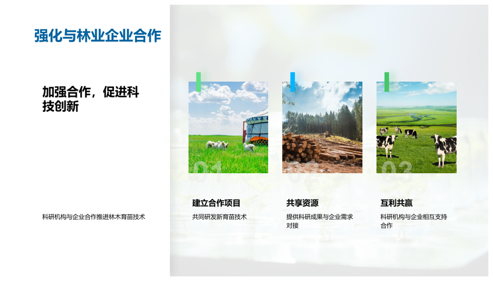 这是一张林木育苗技术创新促林业提质增效PPT模板,包含林木、育苗、技术、创新、林业、提质、增效等主题内容,也可用作林木育苗技术创新、育苗技术创新促林业、技术创新促林业提质、创新促林业提质增效、林木育苗技术、育苗技术创新、技术创新林业、林业提质增效、林木育苗、育苗技术、技术创新、提质增效、林业提质、育苗创新、技术林业等PPT场景使用。