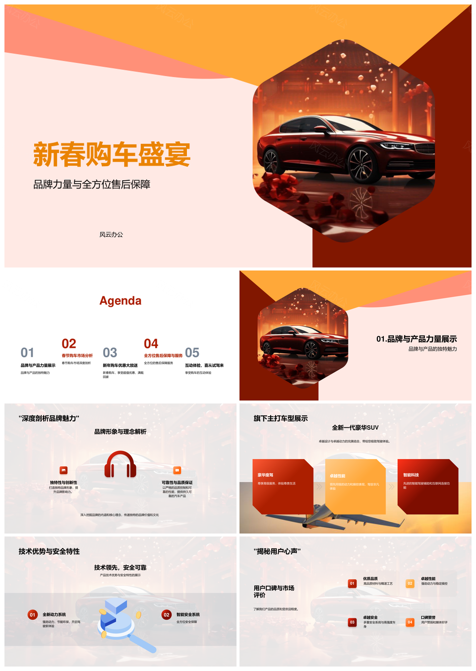 风云办公提供的新春购车盛宴品牌力量技术优势护航PPT模板,下载格式为pptx,一共28页,作品中文字及图均可以修改和编辑,图片更改请在作品中右键图片并更换,文字修改请直接点击文字进行修改。