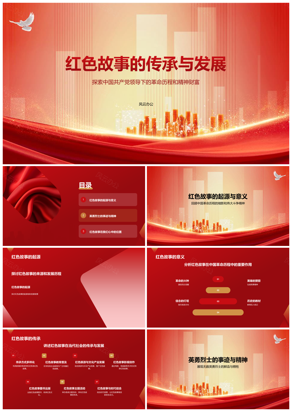 风云办公提供的红色革命历史传承弘扬奉献发展故事PPT模板,下载格式为pptx,一共16页,作品中文字及图均可以修改和编辑,图片更改请在作品中右键图片并更换,文字修改请直接点击文字进行修改。