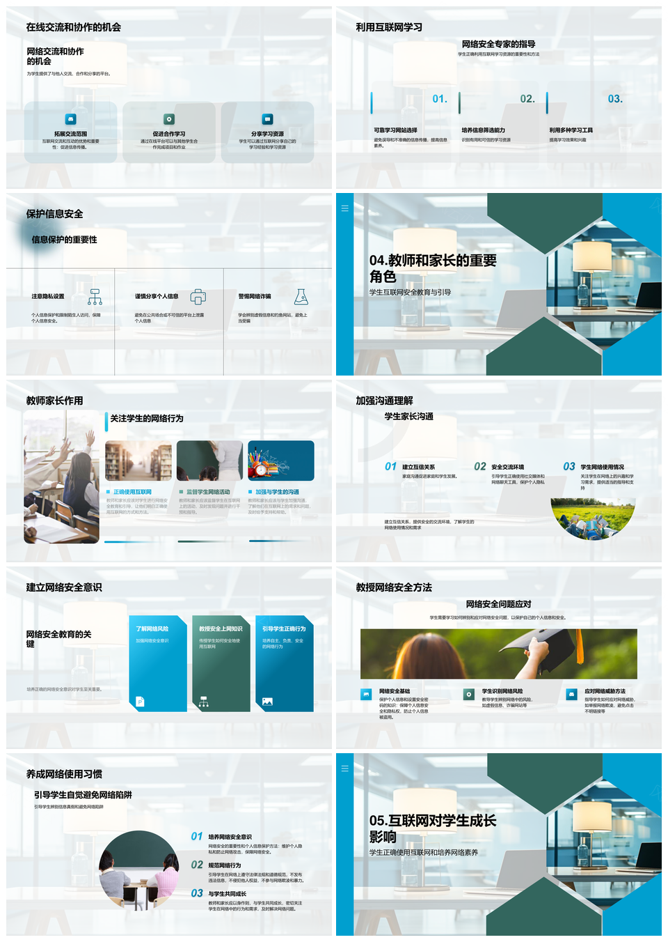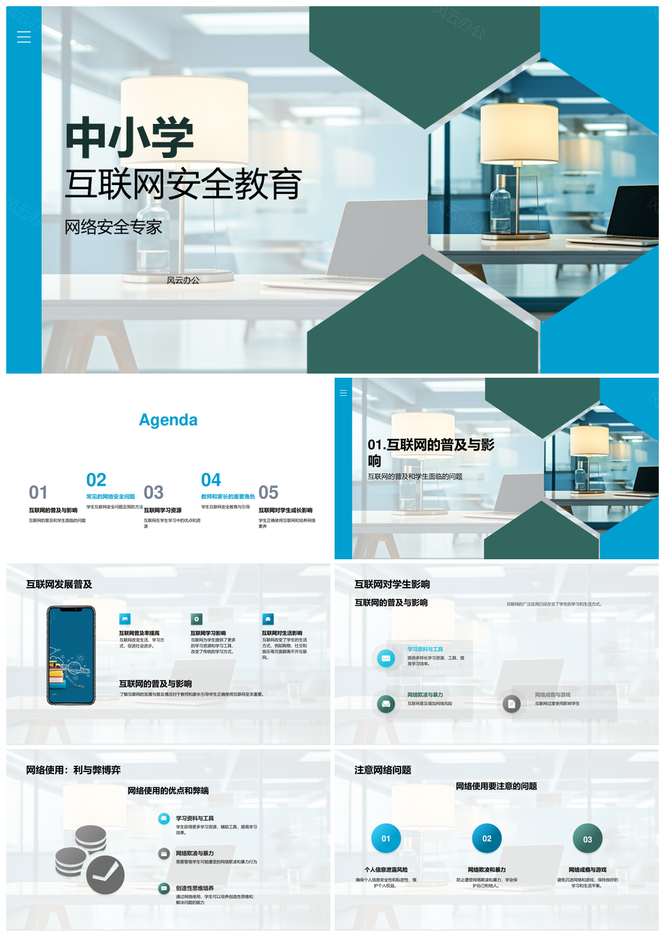 风云办公提供的中小学网安专家师生家长共护学生信息PPT模板,下载格式为pptx,一共33页,作品中文字及图均可以修改和编辑,图片更改请在作品中右键图片并更换,文字修改请直接点击文字进行修改。