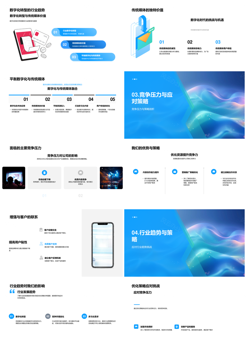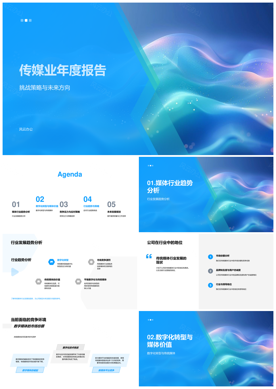 风云办公提供的传媒业年报挑战策略与数字化转型趋势PPT模板,下载格式为pptx,一共23页,作品中文字及图均可以修改和编辑,图片更改请在作品中右键图片并更换,文字修改请直接点击文字进行修改。