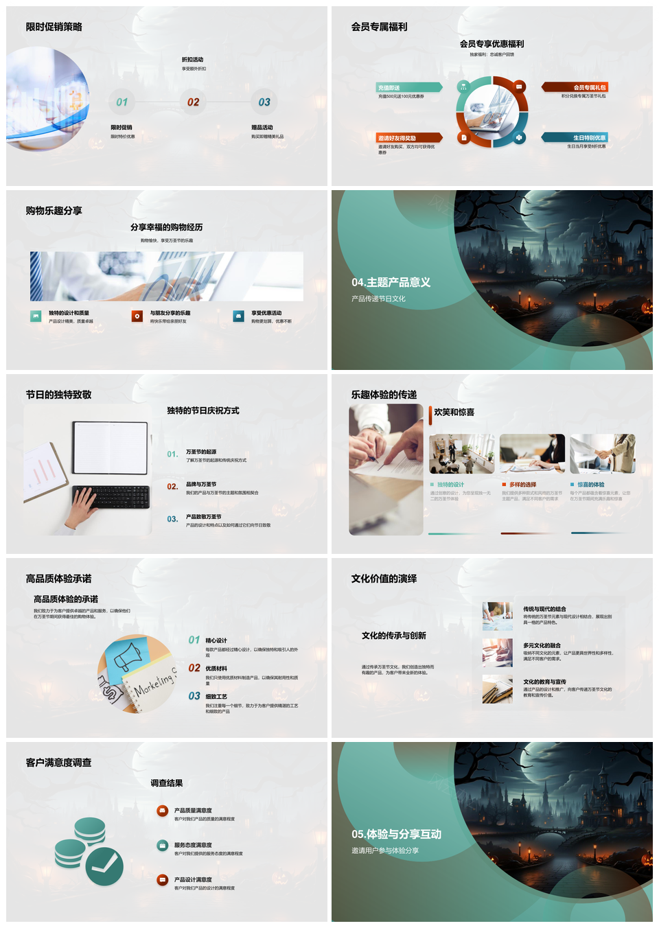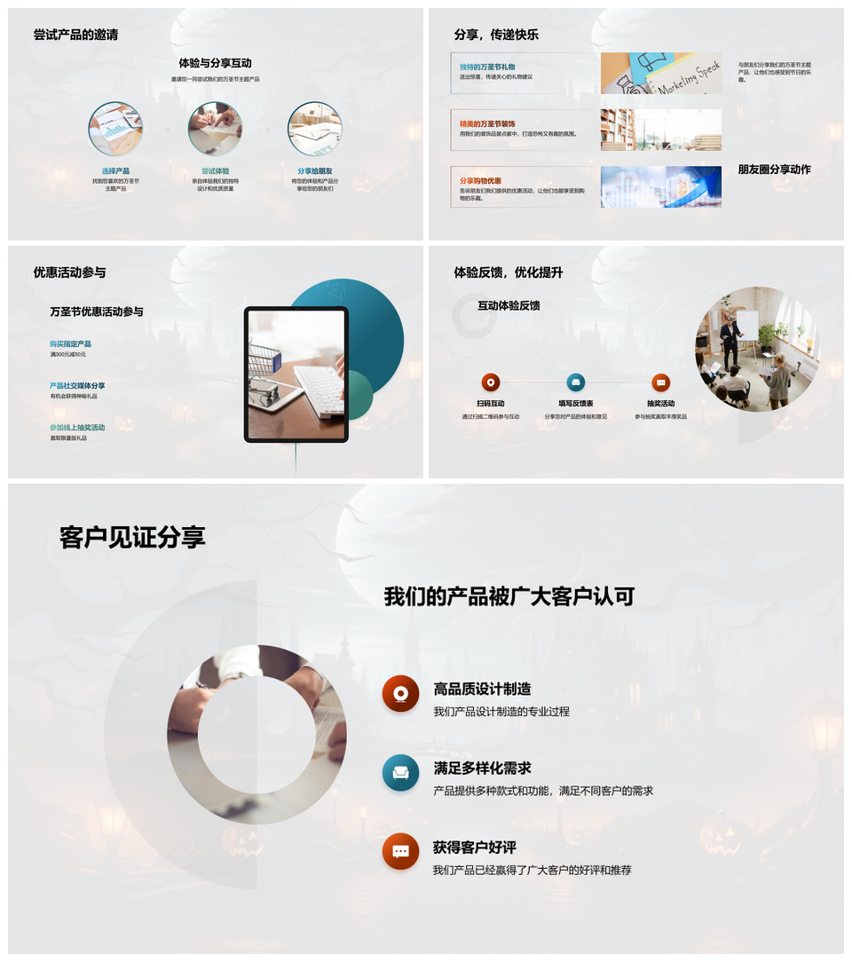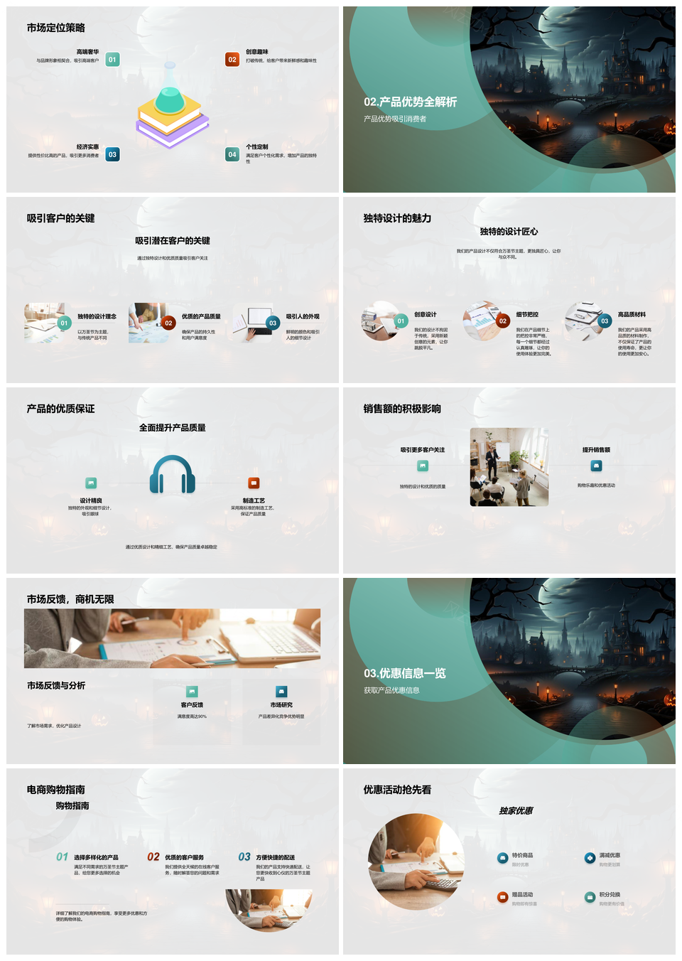 这是一张万圣节主题产品电商促销创意设计热销推荐PPT模板,包含万圣节、主题、产品、电商、促销、创意、设计、热销、推荐等主题内容,也可用作万圣节主题产品电商促销、电商促销创意设计热销、万圣节主题创意设计热销、主题产品促销创意设计、产品电商促销热销推荐、万圣节电商促销创意设计、促销创意设计热销推荐、主题电商促销热销推荐、万圣节促销创意热销推荐、电商创意设计热销推荐、主题产品促销热销、万圣节产品促销热销、电商促销热销推荐、创意设计热销推荐、主题促销热销推荐等PPT场景使用。 风云办公提供的万圣节主题产品电商促销创意设计热销推荐PPT模板,下载格式为pptx,一共33页,作品中文字及图均可以修改和编辑,图片更改请在作品中右键图片并更换,文字修改请直接点击文字进行修改。