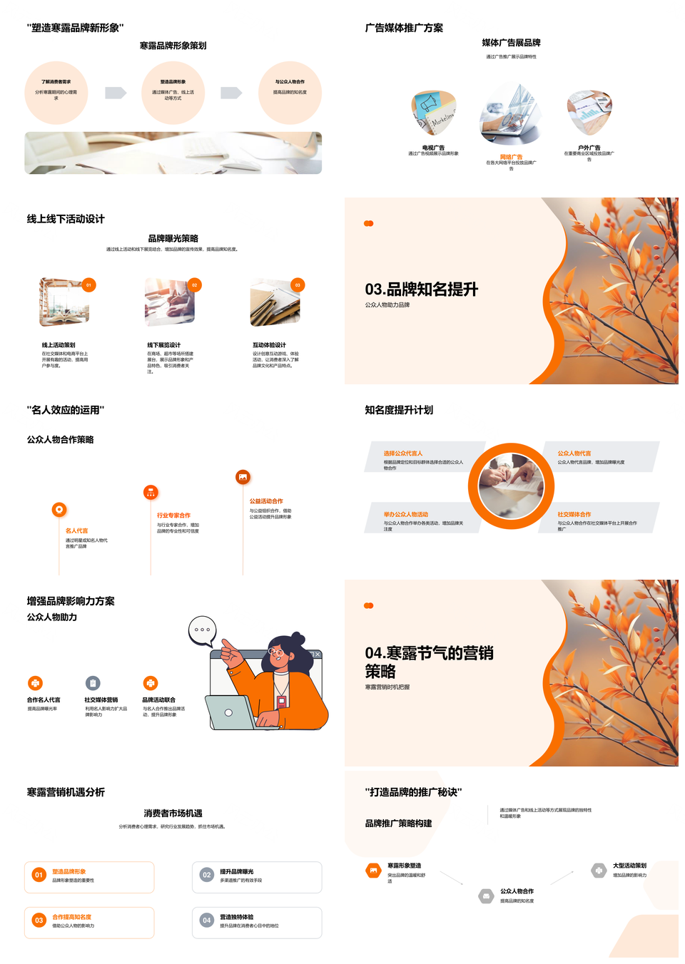 这是一张寒露品牌战略规划结合节气消费需求营销PPT模板,包含寒露、品牌、战略规划、结合、节气、消费需求、营销等主题内容,也可用作寒露品牌战略规划结合节气消费需求营销、品牌战略规划结合节气消费需求、战略规划结合节气消费需求、规划结合节气消费需求营销、品牌结合节气消费需求、节气消费需求营销战略、寒露品牌节气消费、战略规划节气消费、消费需求营销战略、节气消费需求营销、品牌战略节气消费、寒露节气消费营销、品牌消费需求营销、节气消费营销战略、规划消费需求营销等PPT场景使用。 风云办公提供的寒露品牌战略规划结合节气消费需求营销PPT模板,下载格式为pptx,一共23页,作品中文字及图均可以修改和编辑,图片更改请在作品中右键图片并更换,文字修改请直接点击文字进行修改。