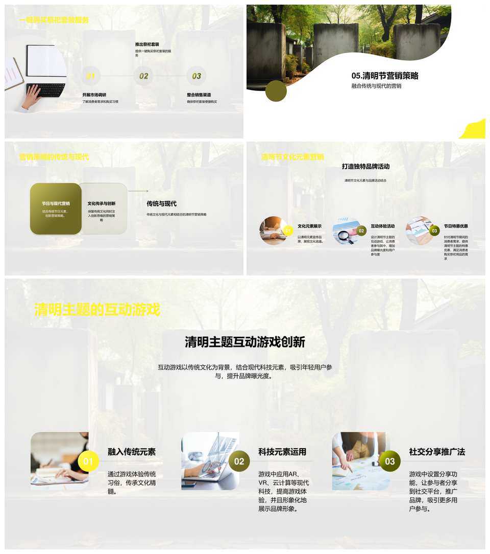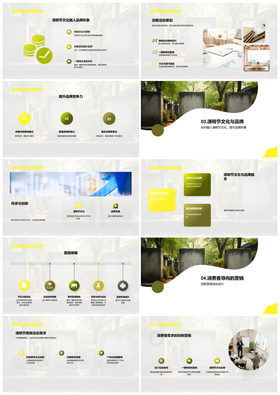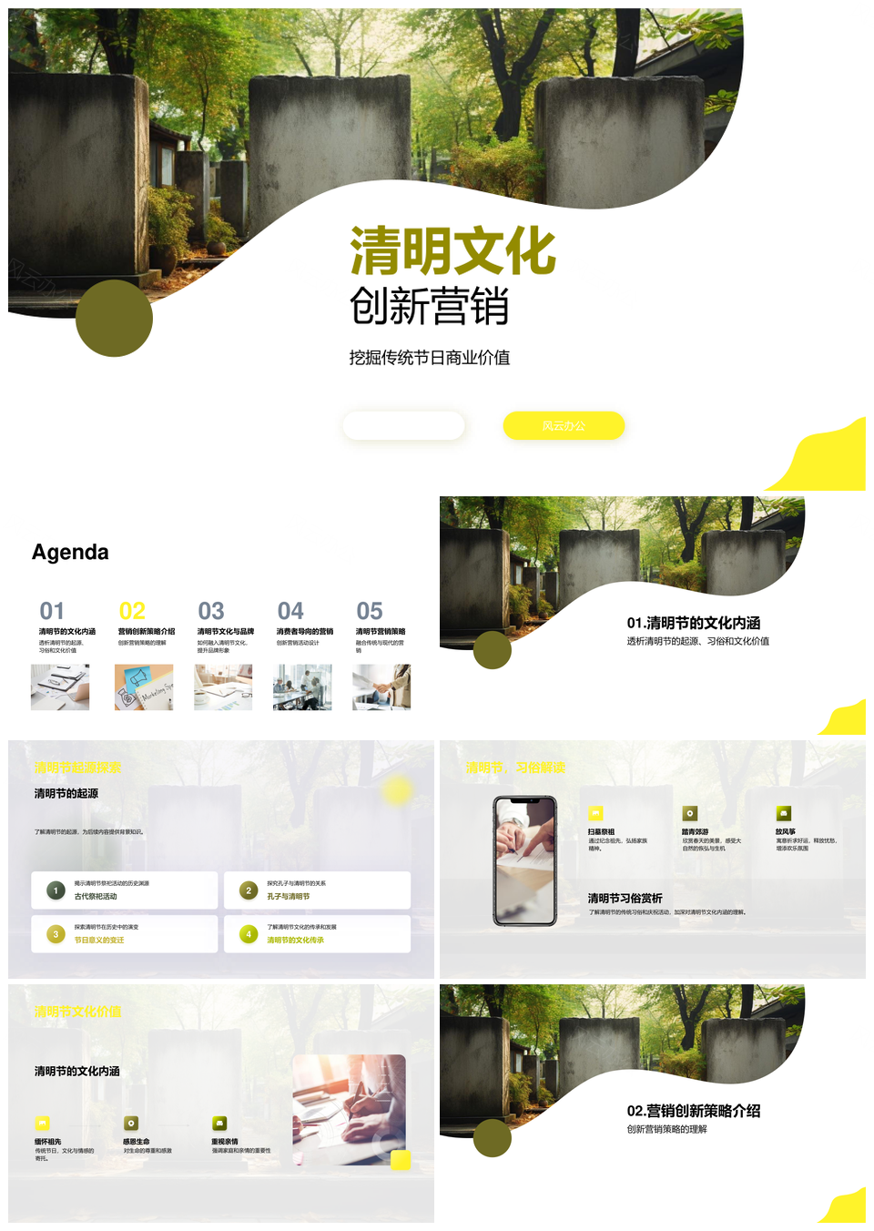 风云办公提供的清明文化创新营销融合传统互动策略PPT模板,下载格式为pptx,一共23页,作品中文字及图均可以修改和编辑,图片更改请在作品中右键图片并更换,文字修改请直接点击文字进行修改。