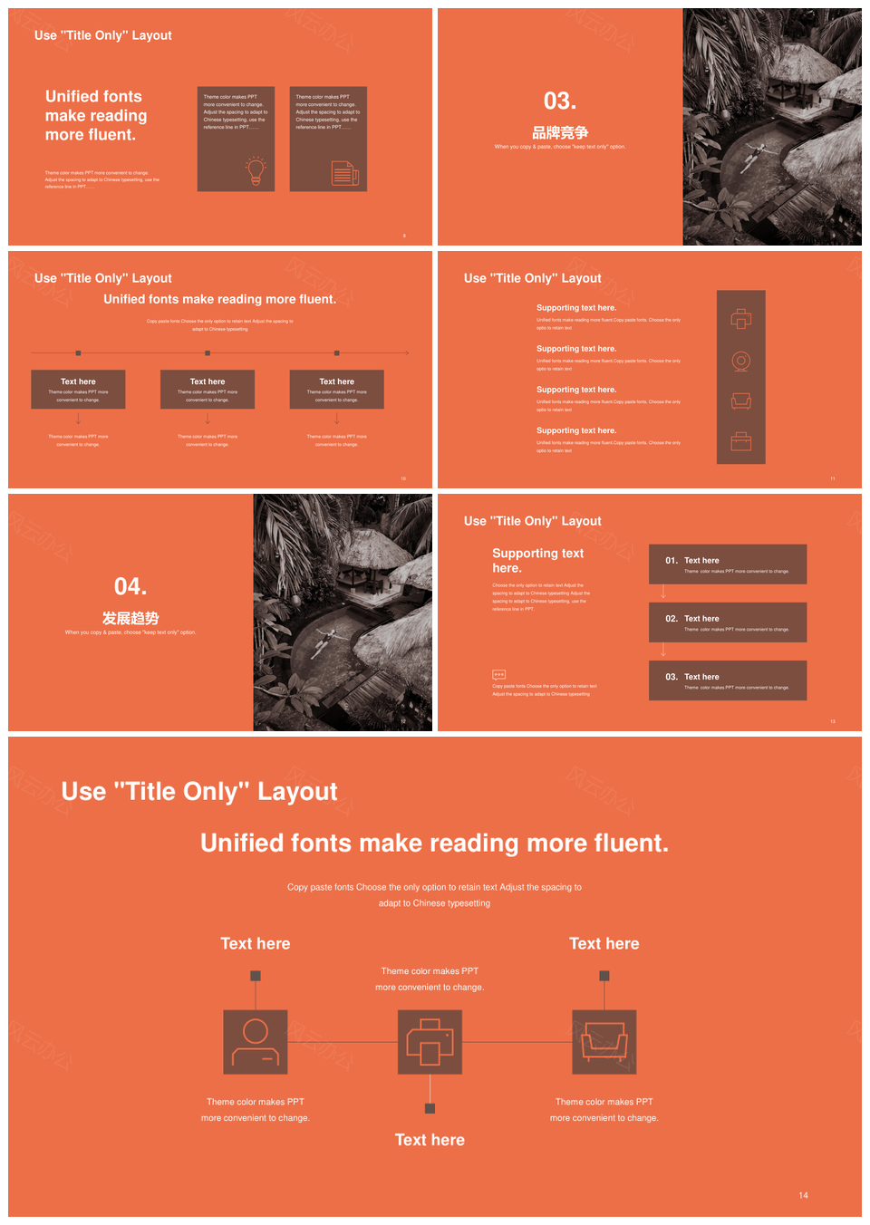 本套模板以复古橙为主色调,融合经典几何纹理与现代极简线条,低饱和度配色巧妙平衡商务质感与视觉温度,深咖渐变叠加磨砂肌理沉淀专业气场。模块化版面采用非对称布局,内置可编辑矢量插画与做旧光斑素材,既满足创意提案所需的视觉冲击力,也适配产业分析等重度数据场景。文字排版通过字号对比构建层级关系,每页保留30%留白空间保障阅读流畅性,适用于科技峰会、品牌升级、文创路演等需要兼顾严谨与美学的商务场景。