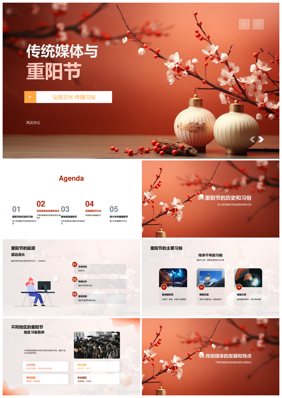 风云办公提供的传统媒体中的重阳节习俗与文化传播PPT模板,下载格式为pptx,一共23页,作品中文字及图均可以修改和编辑,图片更改请在作品中右键图片并更换,文字修改请直接点击文字进行修改。