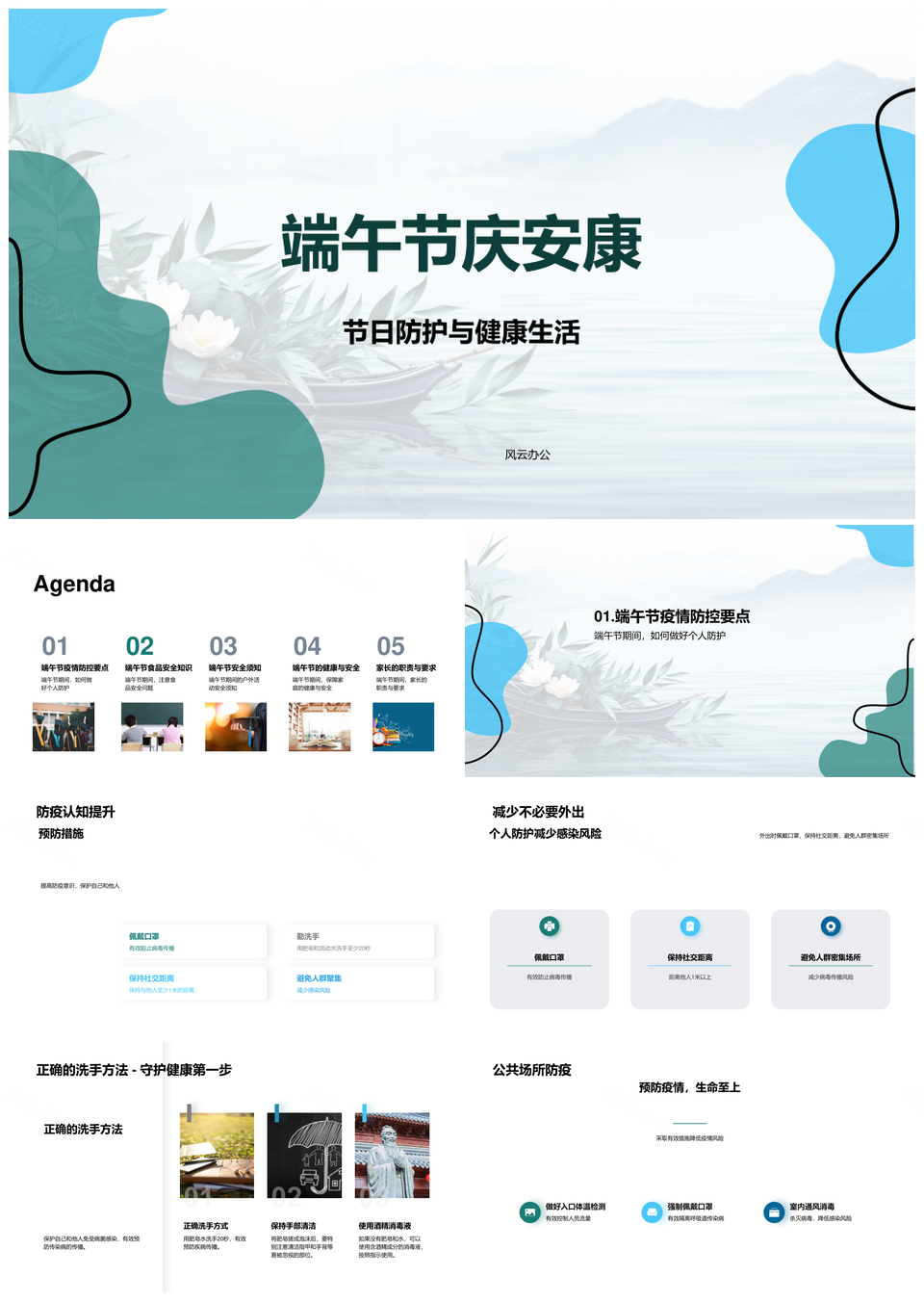 风云办公提供的端午防疫健康食安龙舟户外安全PPT模板,下载格式为pptx,一共33页,作品中文字及图均可以修改和编辑,图片更改请在作品中右键图片并更换,文字修改请直接点击文字进行修改。