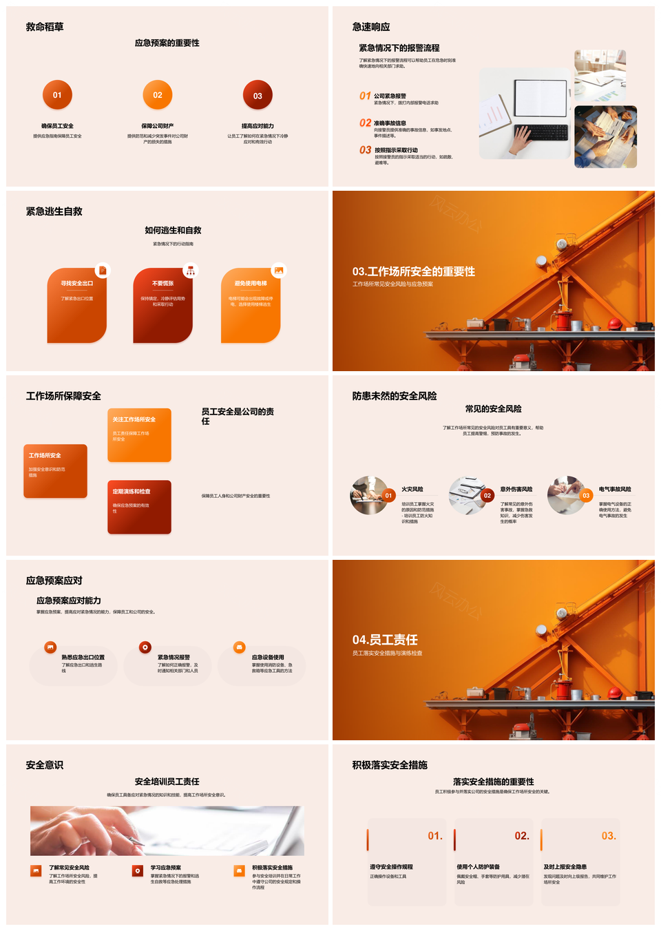 风云办公提供的员工安全教育培训应急演练自救措施PPT模板,下载格式为pptx,一共23页,作品中文字及图均可以修改和编辑,图片更改请在作品中右键图片并更换,文字修改请直接点击文字进行修改。