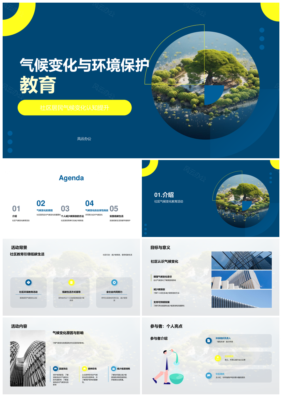 风云办公提供的社区居民环保教育提升气候变化认知PPT模板,下载格式为pptx,一共24页,作品中文字及图均可以修改和编辑,图片更改请在作品中右键图片并更换,文字修改请直接点击文字进行修改。