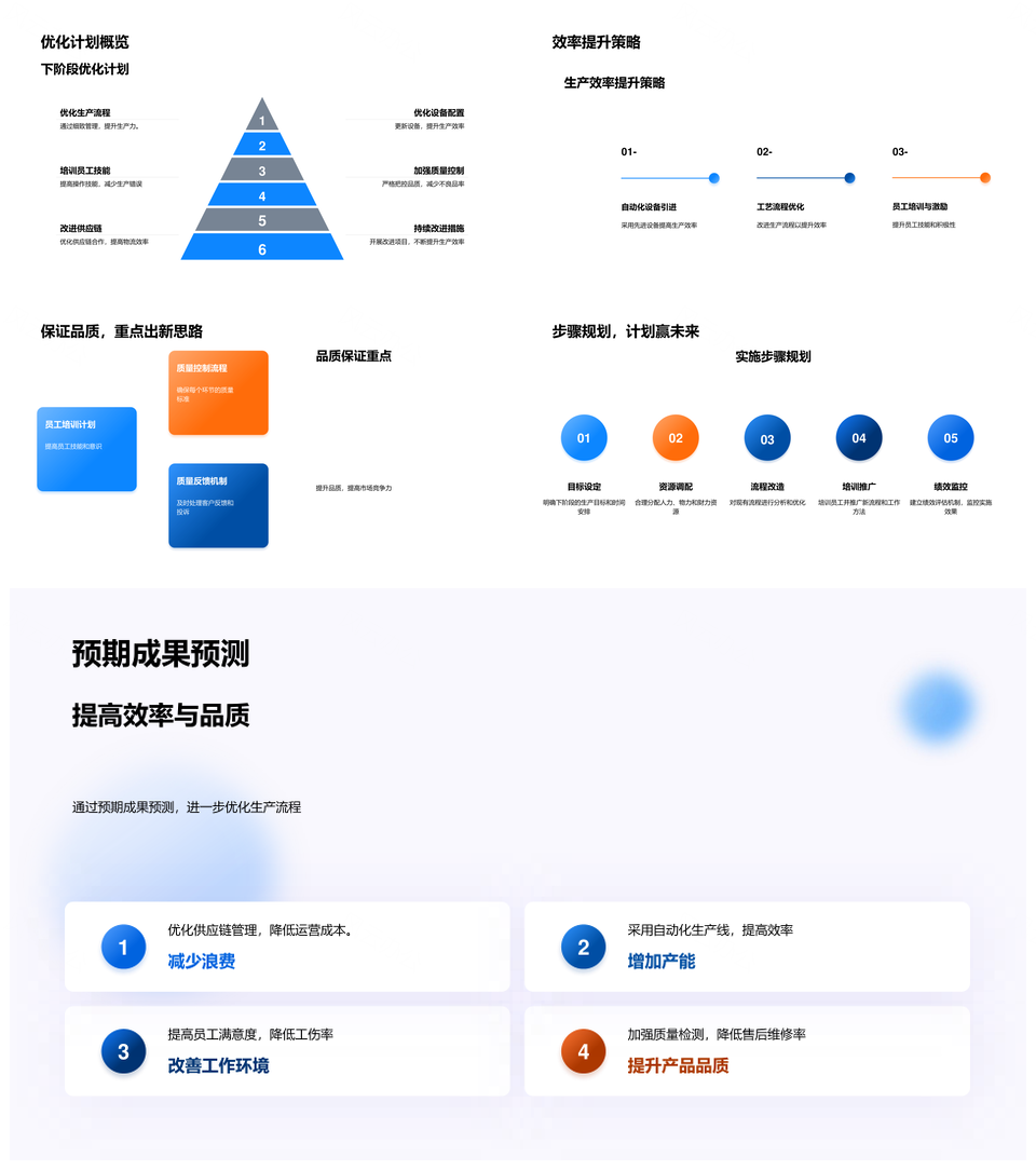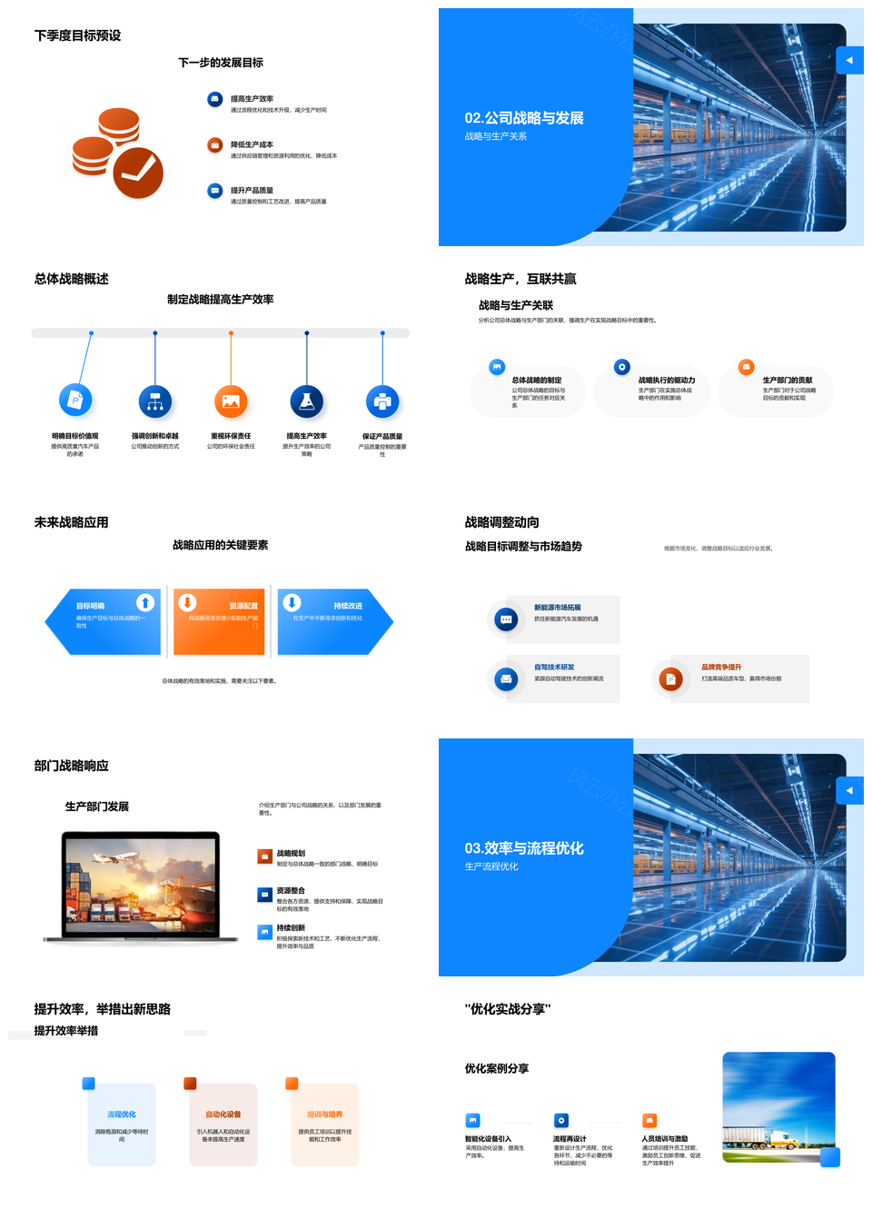 这是一张优化策略提升产线效率品质产能促战略目标PPT模板,包含优化、策略、提升、产线、效率、品质、产能、促、战略、目标等主题内容,也可用作优化策略提升产线、策略提升产线效率、提升产线效率品质、产线效率品质产能、效率品质产能战略、品质产能战略目标、优化策略提升、策略提升产线、提升产线效率、产线效率品质、效率品质产能、品质产能战略、产能战略目标、优化策略、战略目标等PPT场景使用。 风云办公提供的优化策略提升产线效率品质产能促战略目标PPT模板,下载格式为pptx,一共33页,作品中文字及图均可以修改和编辑,图片更改请在作品中右键图片并更换,文字修改请直接点击文字进行修改。