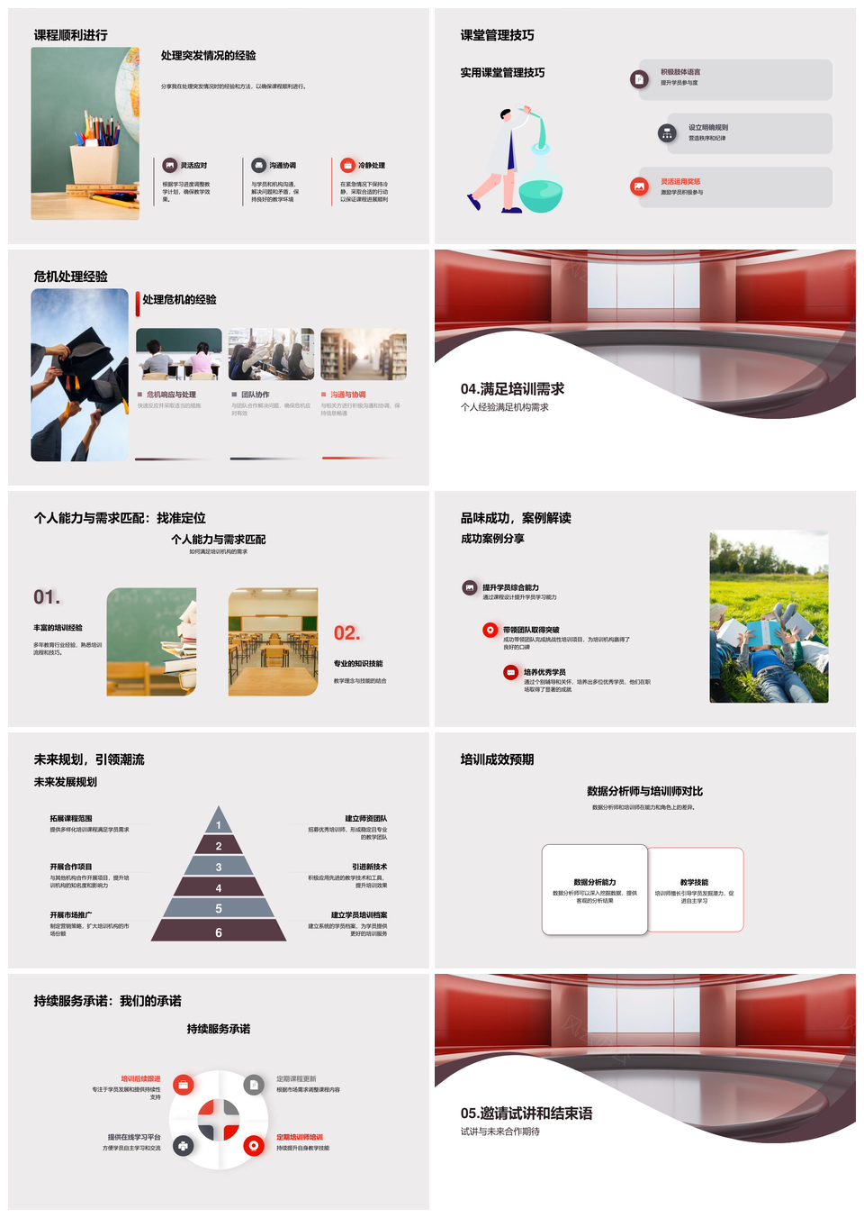 这是一张专业培训师引导出彩匹配需求经验展望教育PPT模板,包含专业培训师、引导、出彩、匹配、需求、经验、展望、教育等主题内容,也可用作专业培训师引导出彩、专业培训师引导、专业培训师、培训师引导出彩匹配、培训师引导出彩、培训师引导、引导出彩匹配需求、引导出彩匹配、引导出彩、出彩匹配需求经验、出彩匹配需求、出彩匹配、匹配需求经验展望、匹配需求经验、匹配需求等PPT场景使用。 风云办公提供的专业培训师引导出彩匹配需求经验展望教育PPT模板,下载格式为pptx,一共33页,作品中文字及图均可以修改和编辑,图片更改请在作品中右键图片并更换,文字修改请直接点击文字进行修改。