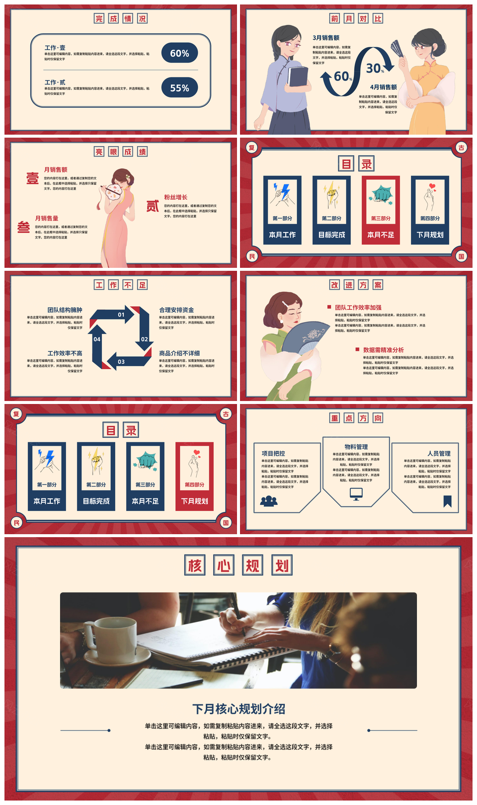 风云办公提供的复古民国创意卡通插画工作汇报PPT模板,下载格式为pptx,一共17页,作品中文字及图均可以修改和编辑,图片更改请在作品中右键图片并更换,文字修改请直接点击文字进行修改。