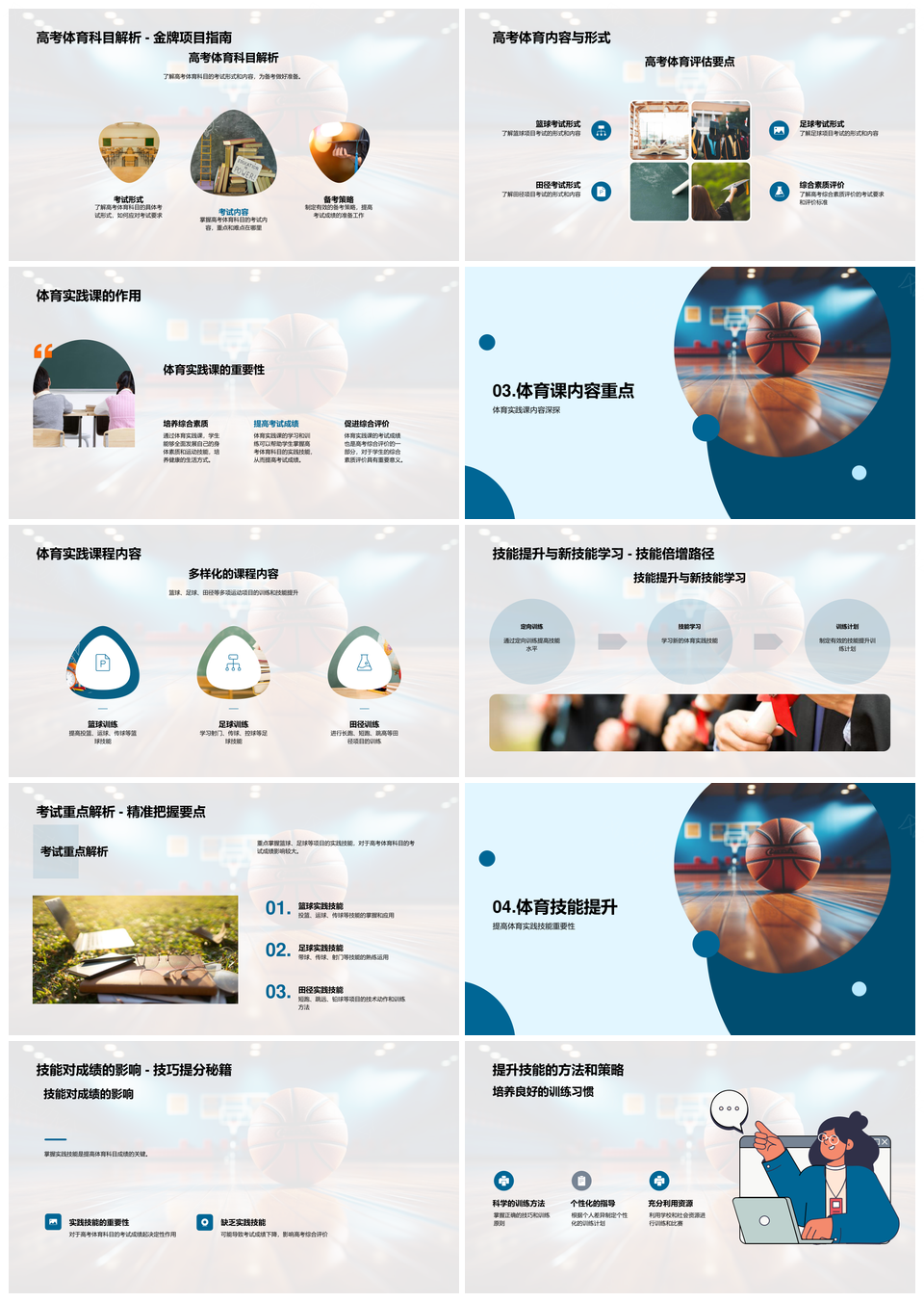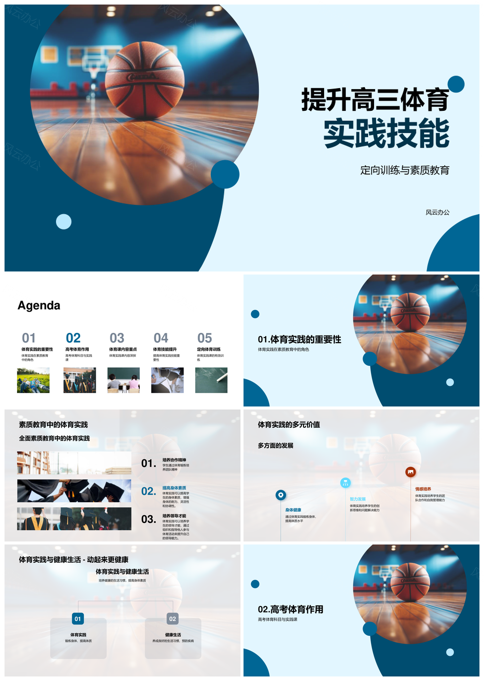 风云办公提供的高三体育实践技能提升与高考定向训练PPT模板,下载格式为pptx,一共23页,作品中文字及图均可以修改和编辑,图片更改请在作品中右键图片并更换,文字修改请直接点击文字进行修改。