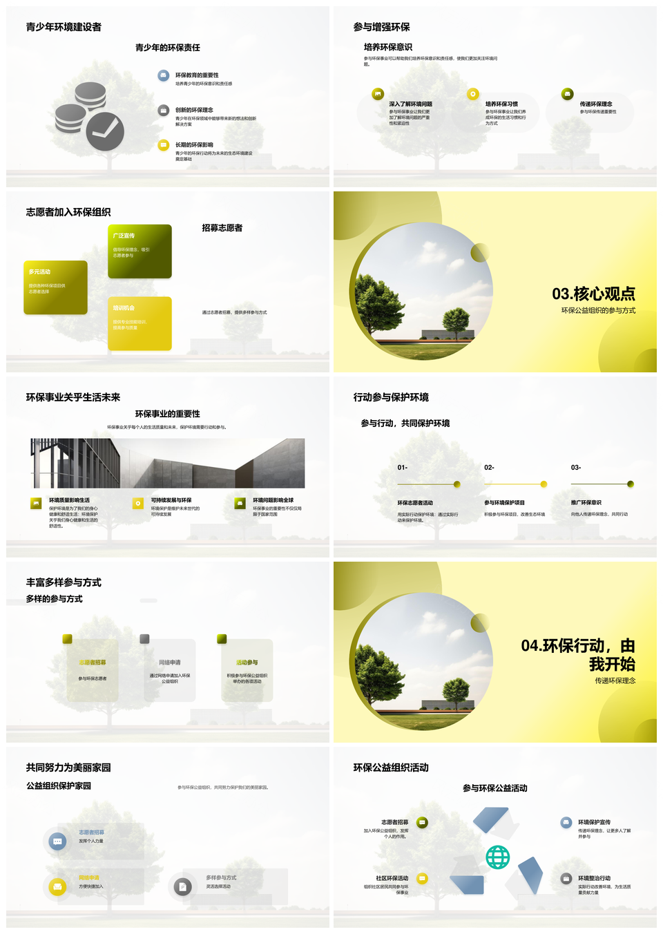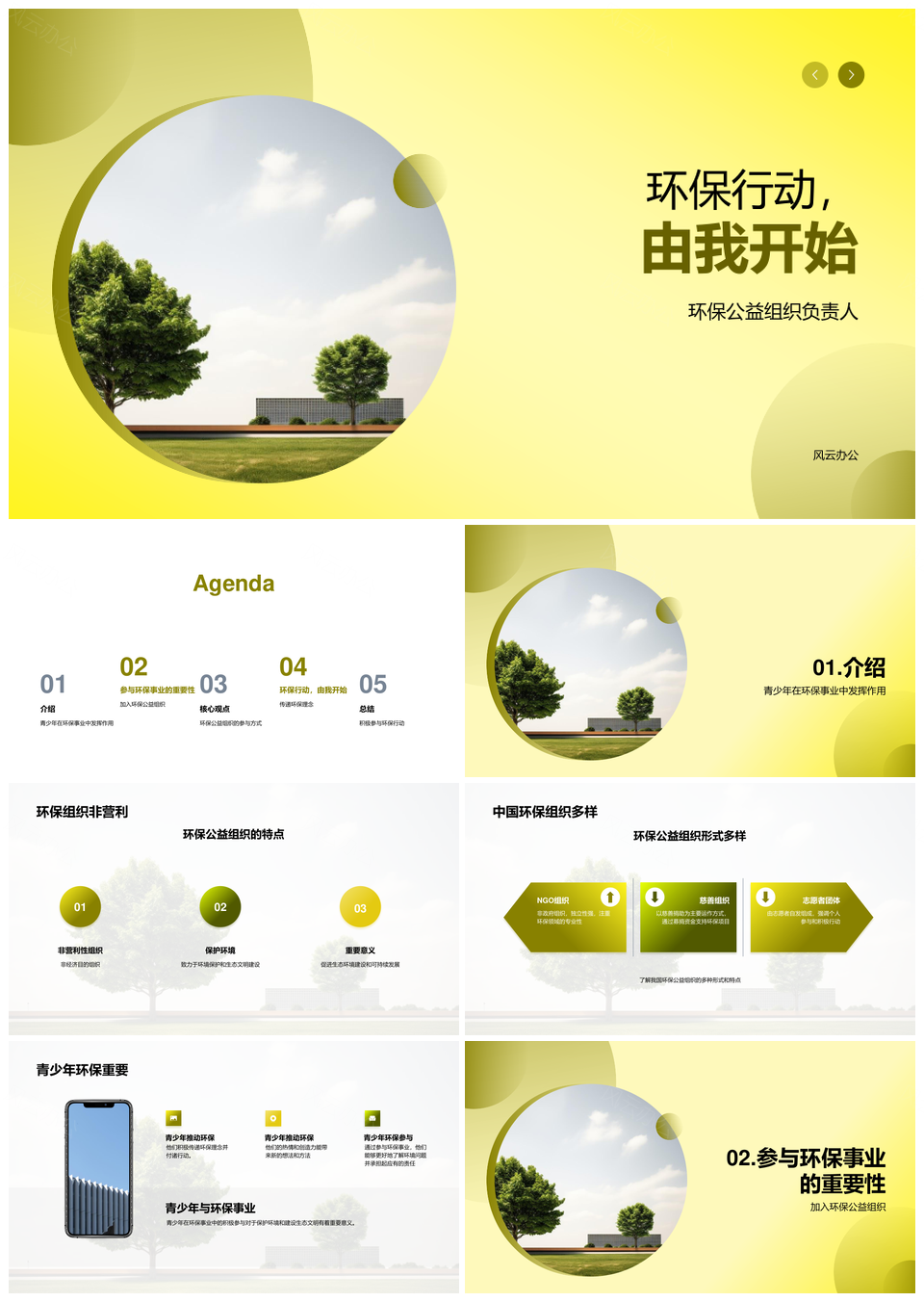 风云办公提供的青少年参与环保公益植树共建生态文明PPT模板,下载格式为pptx,一共23页,作品中文字及图均可以修改和编辑,图片更改请在作品中右键图片并更换,文字修改请直接点击文字进行修改。