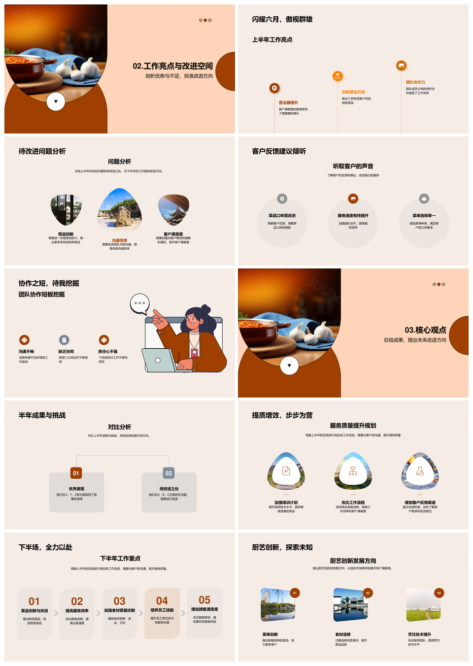风云办公提供的厨师团队半年服务提升与客户反馈总结PPT模板,下载格式为pptx,一共28页,作品中文字及图均可以修改和编辑,图片更改请在作品中右键图片并更换,文字修改请直接点击文字进行修改。