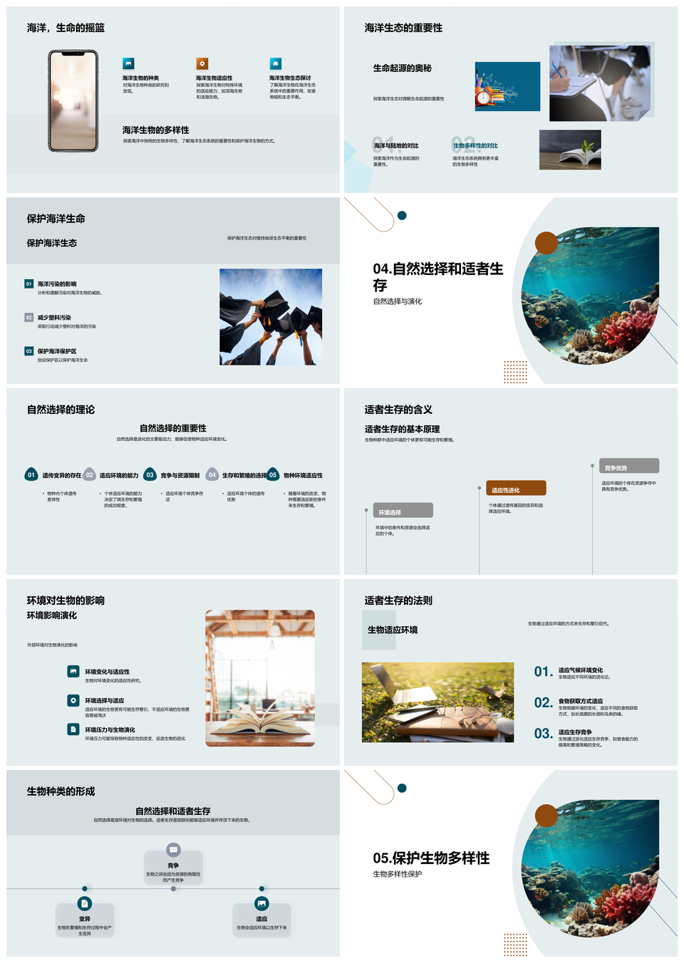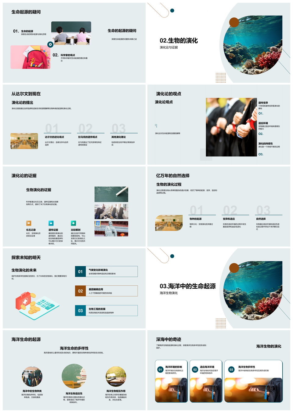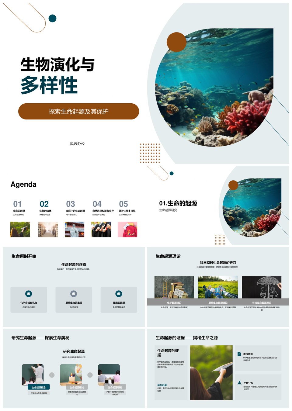 风云办公提供的海洋生物演化与自然选择的多样性起源PPT模板,下载格式为pptx,一共33页,作品中文字及图均可以修改和编辑,图片更改请在作品中右键图片并更换,文字修改请直接点击文字进行修改。