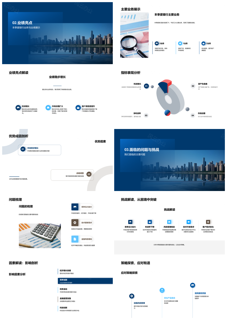 风云办公提供的银行业季度业绩亮点挑战与经营策略PPT模板,下载格式为pptx,一共28页,作品中文字及图均可以修改和编辑,图片更改请在作品中右键图片并更换,文字修改请直接点击文字进行修改。