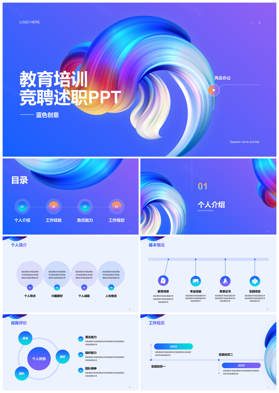 蓝紫渐变3D流体创意酷炫教育竞聘述职PPT模板推荐