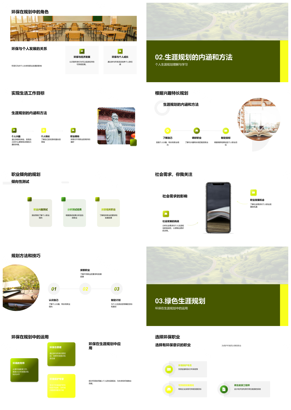 风云办公提供的环保教育兴趣导向绿色生涯规划PPT模板,下载格式为pptx,一共33页,作品中文字及图均可以修改和编辑,图片更改请在作品中右键图片并更换,文字修改请直接点击文字进行修改。